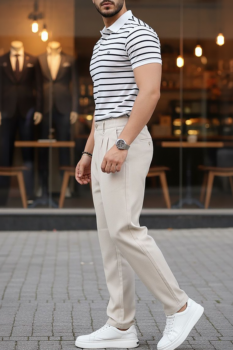 - Κομψό ανδρικό παντελόνι σε χρώμα εκρού με λιτό σχεδιασμό, τσέπες και ίσια μπατζάκια, με το οποίο θα τραβήξετε όλα τα βλέμματα.