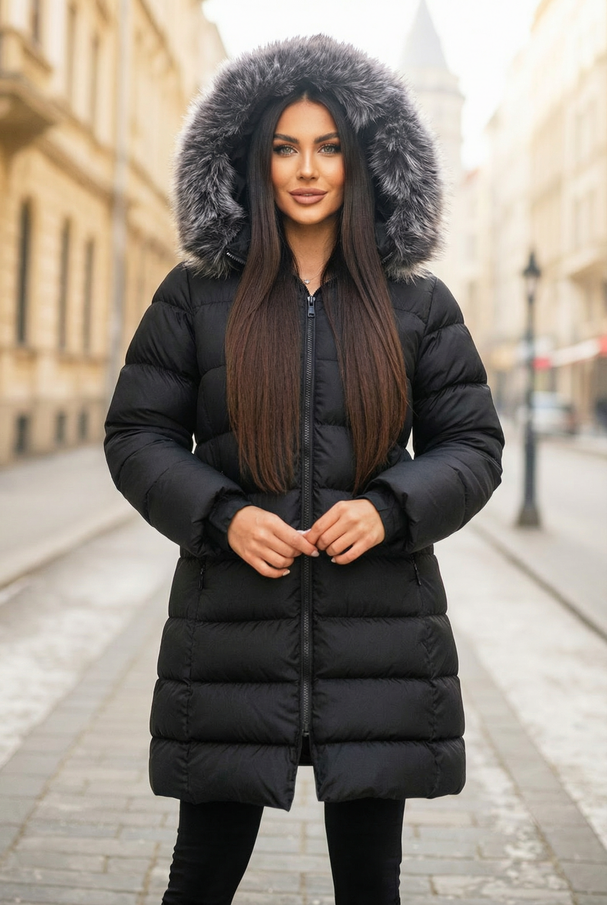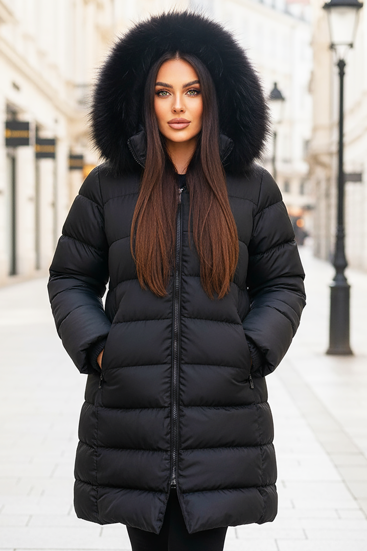 - Το μοντέλο έχει άνετη γραμμή, κλείσιμο με φερμουάρ, πρακτικές τσέπες και κουκούλα με γούνα.