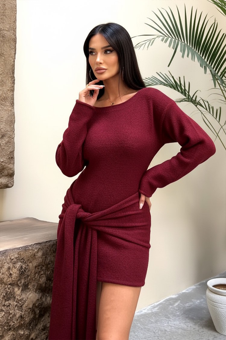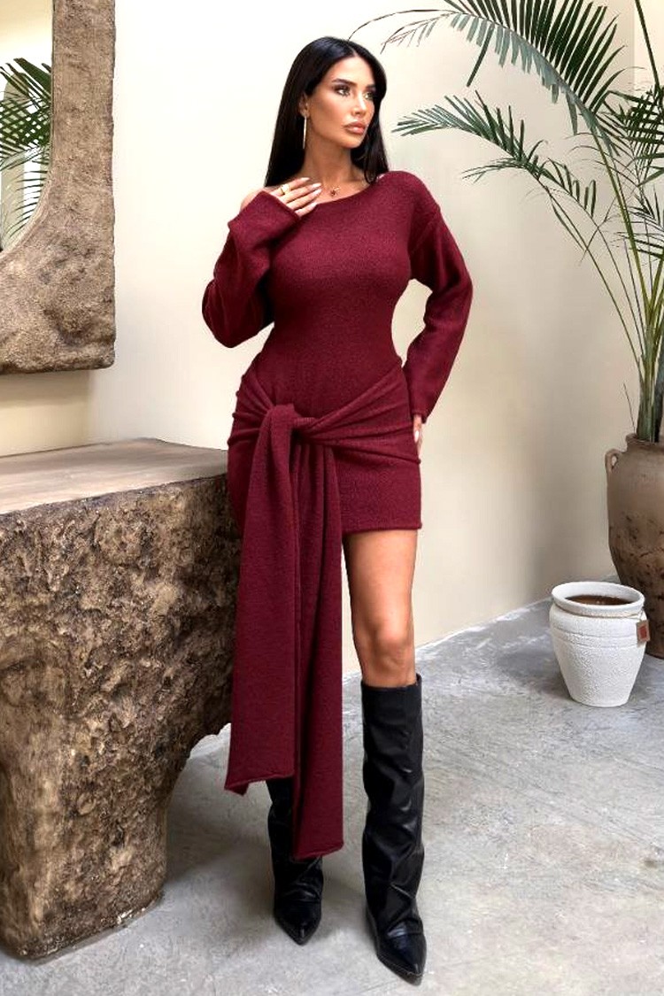 - Το φόρεμα έχει εφαρμοστή γραμμή, μακριά μανίκια, πεσμένους ώμους και εντυπωσιακή ζώνη από το ίδιο ύφασμα.