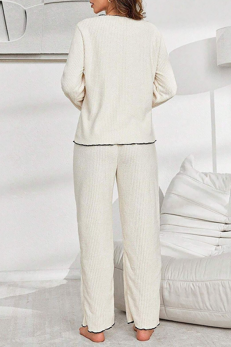 - Το πάνω μέρος κλείνει με κουμπιά κατά μήκος, ενώ το παντελόνι έχει ψηλή μέση και ελεύθερη γραμμή.