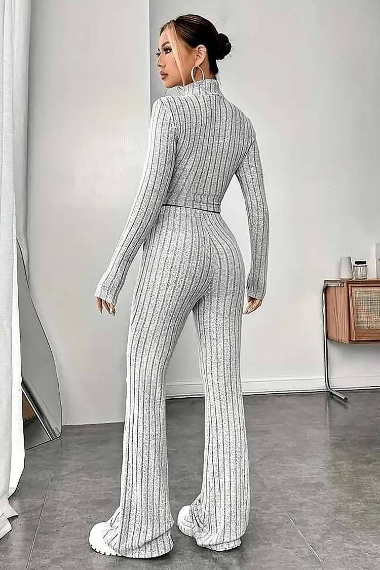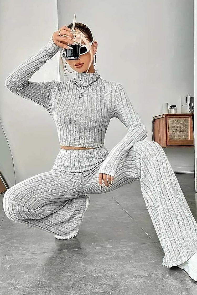 - Η μπλούζα έχει άνετη γραμμή και κοντό μήκος, ενώ το παντελόνι έχει ψηλή μέση και φαρδιά μπατζάκια.