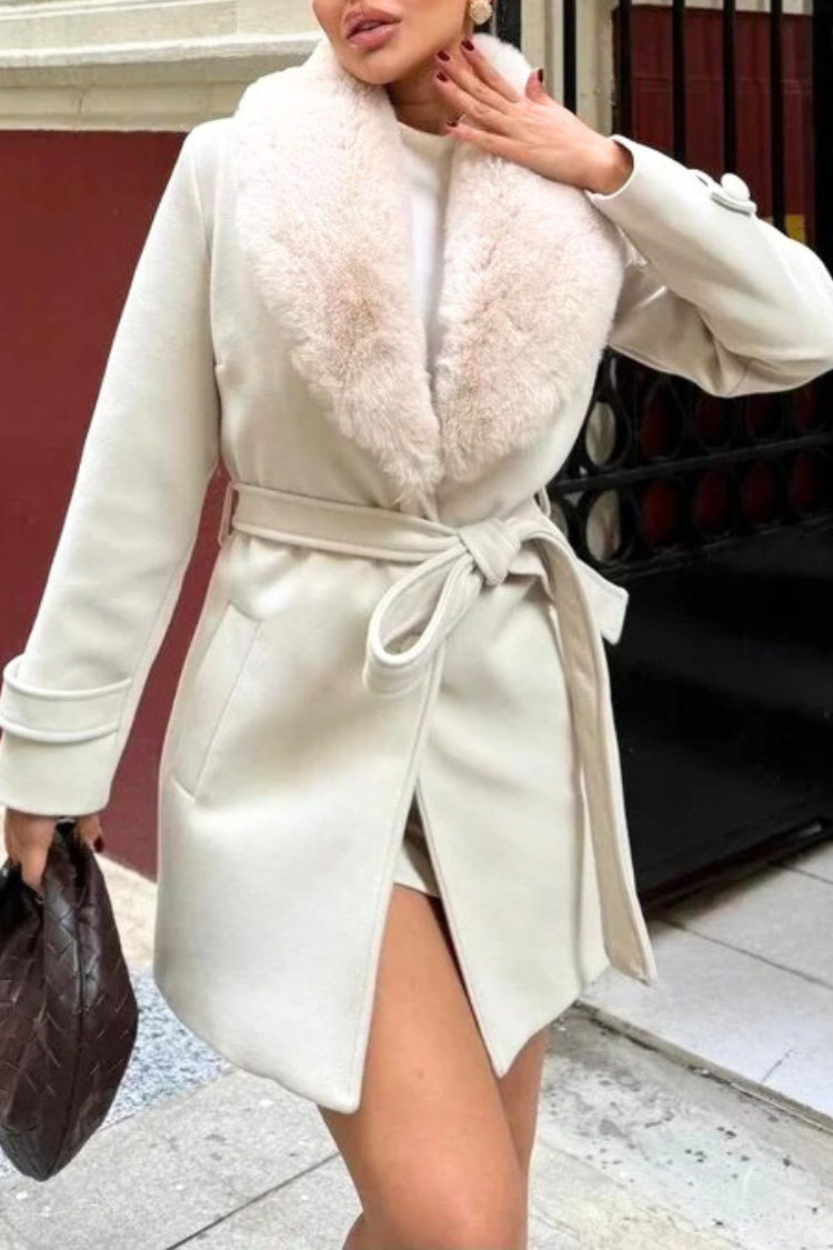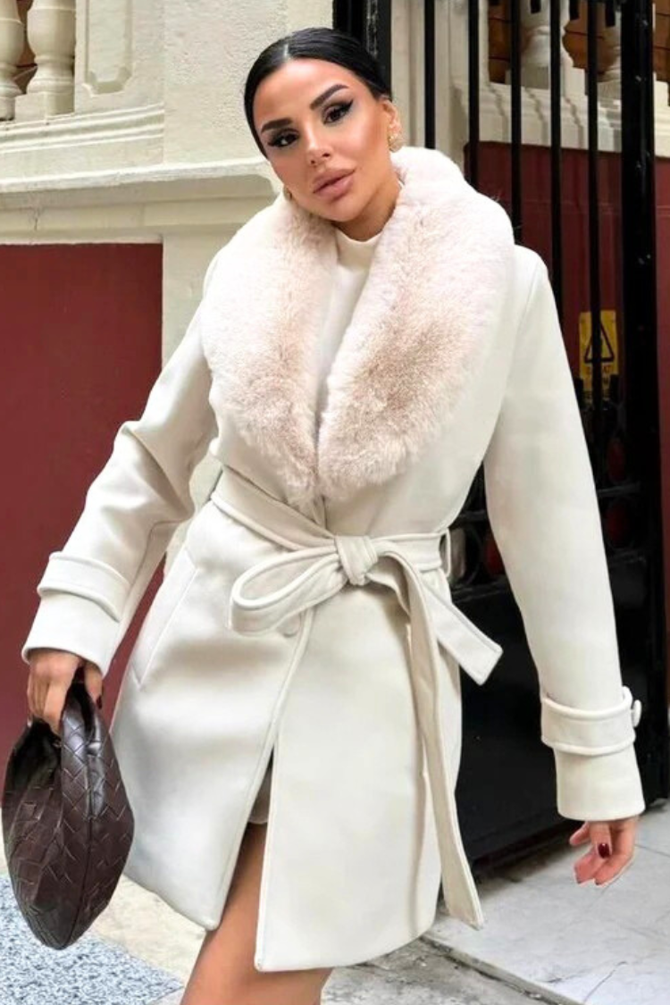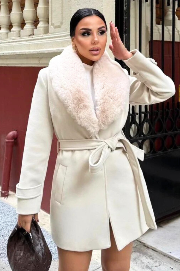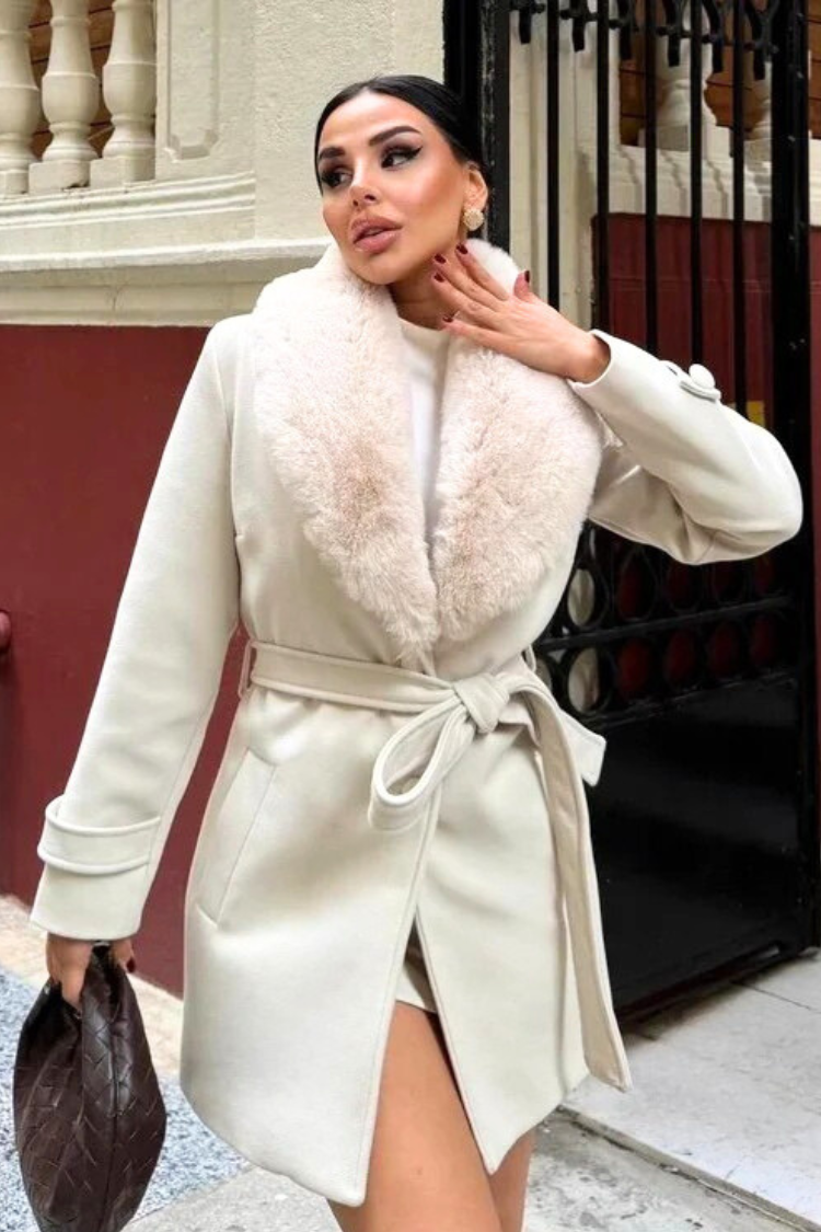 - Το μοντέλο έχει κλασική γραμμή, γιακά με γούνα και ζώνη από το ίδιο ύφασμα.