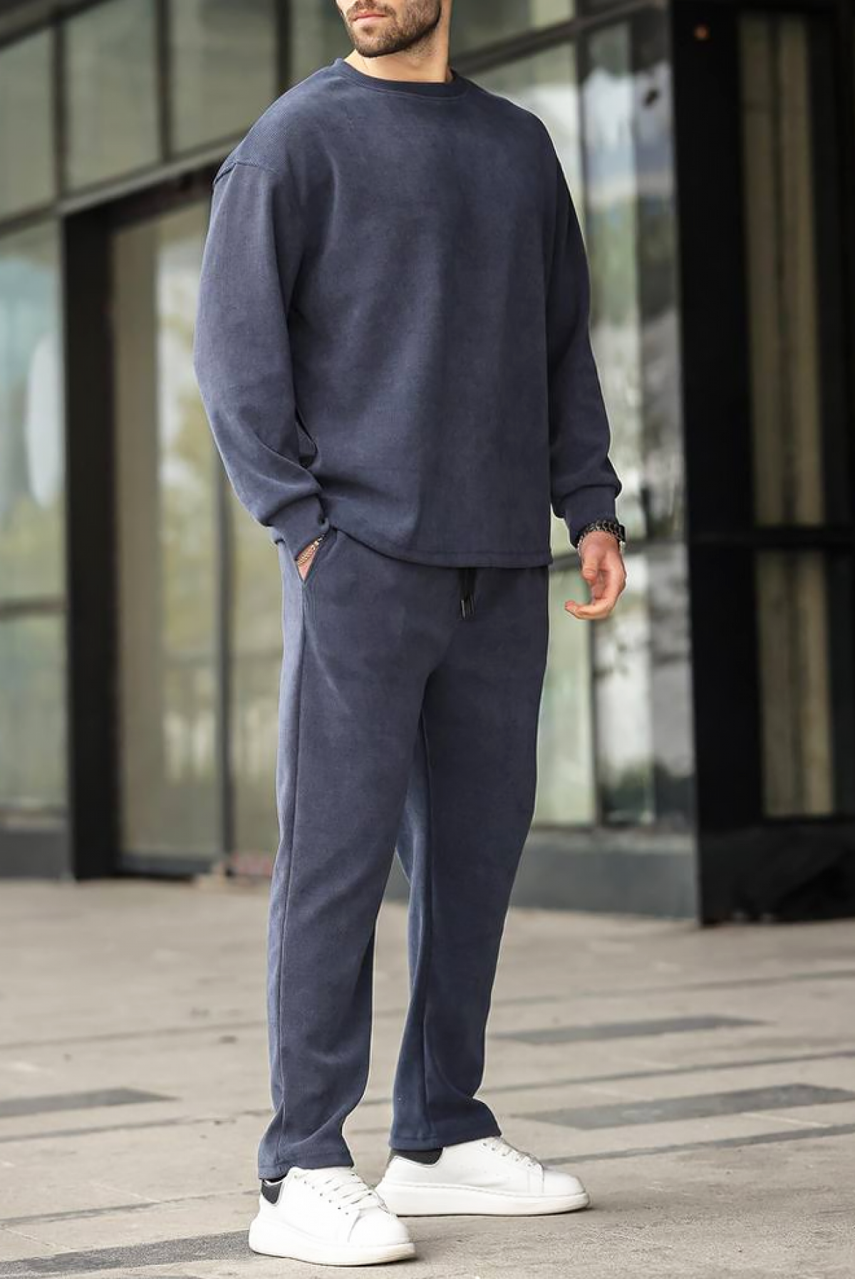 - Άνετο ανδρικό σετ σε σκούρο μπλε χρώμα, που αποτελείται από δύο κομμάτια, ένα φούτερ και ένα παντελόνι.