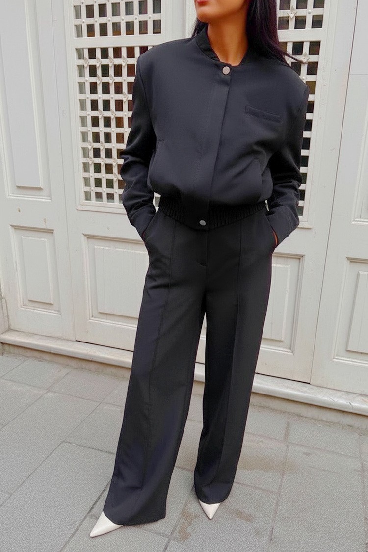 - Το μεταβατικό μπουφάν έχει κλασικό σχεδιασμό και φερμουάρ, ενώ το παντελόνι έχει κομψή και ελεύθερη γραμμή.