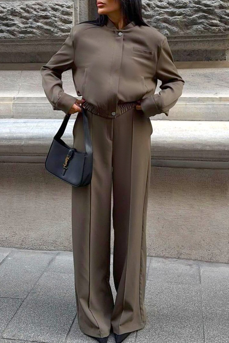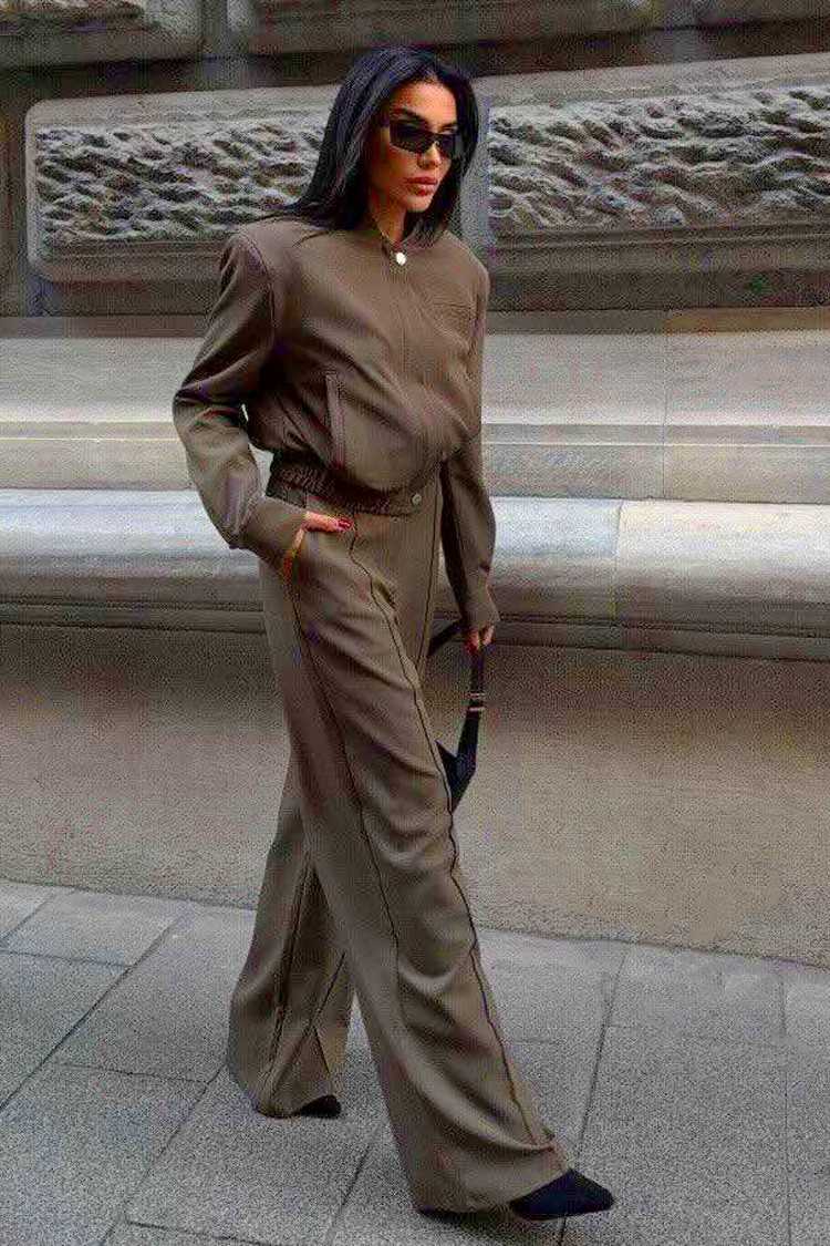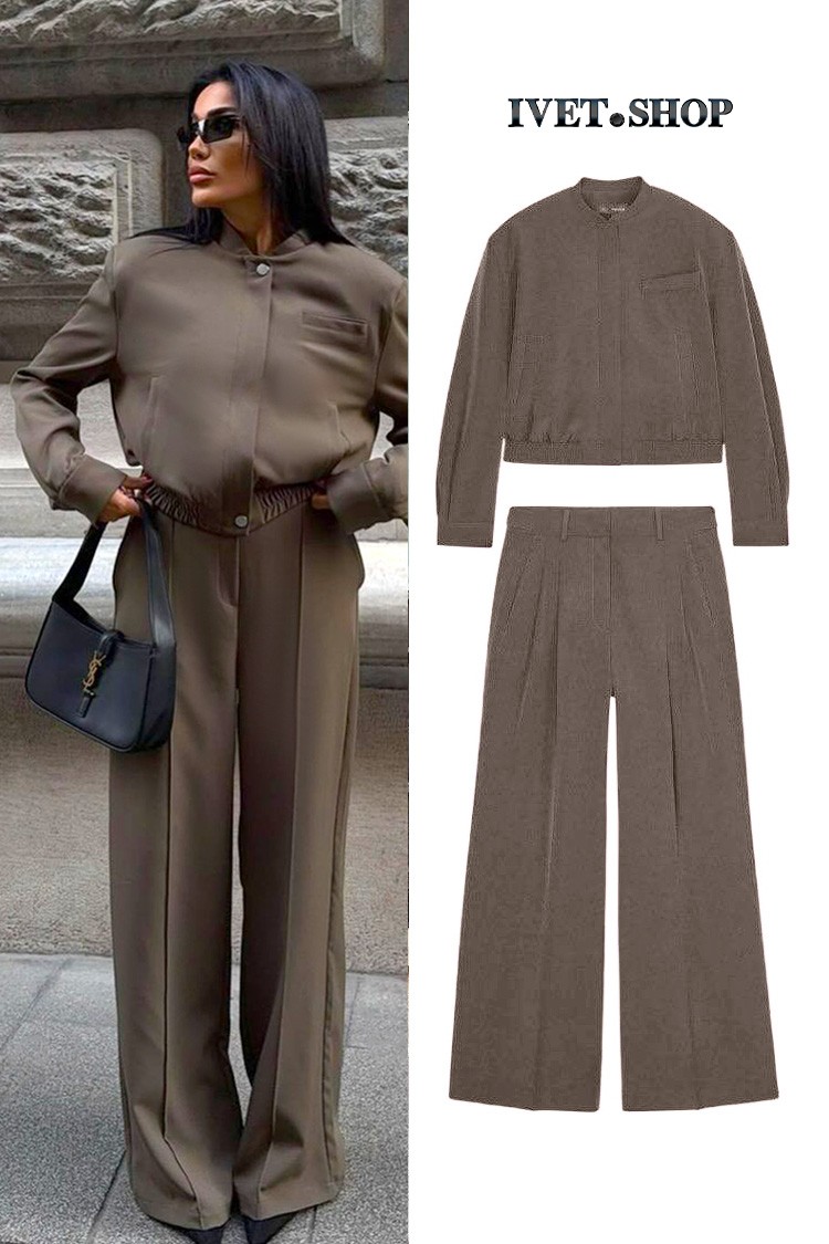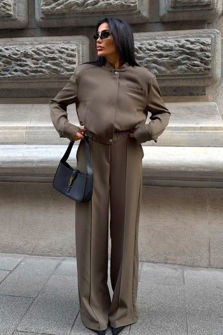 - Το μεταβατικό μπουφάν έχει κλασικό σχεδιασμό και φερμουάρ, ενώ το παντελόνι έχει κομψή και ελεύθερη γραμμή.