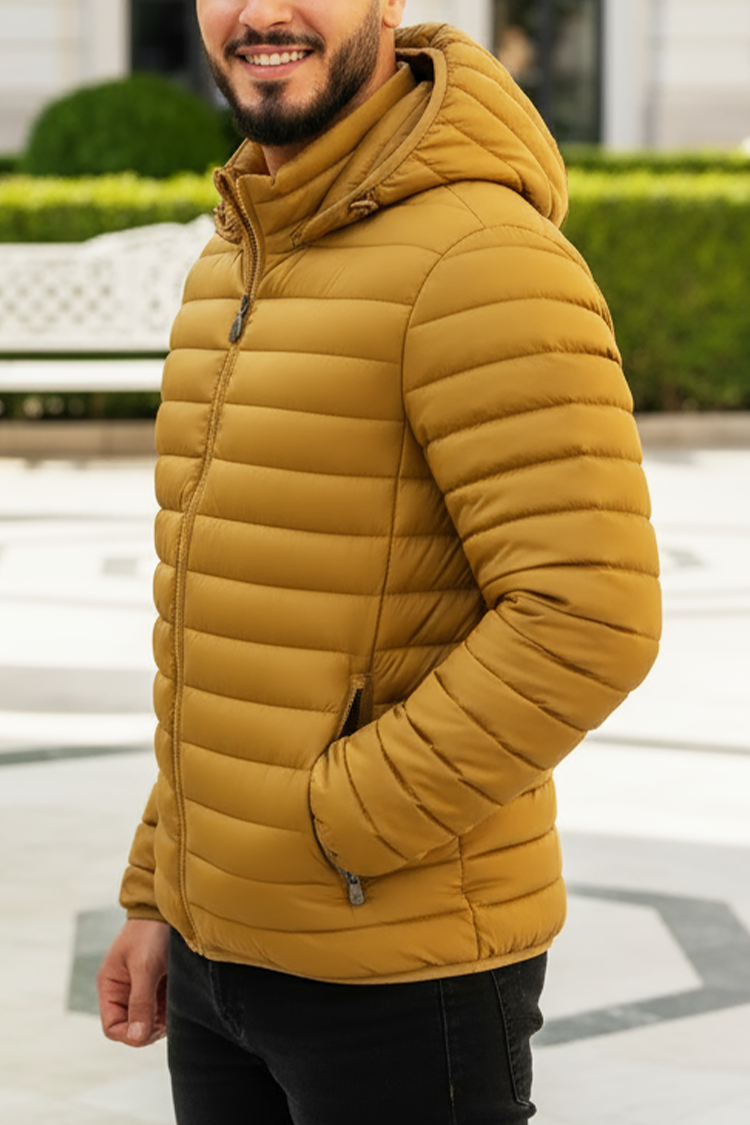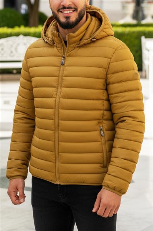 - Άνετο ανδρικό μπουφάν με καπιτονέ σχέδιο και αφαιρούμενη κουκούλα σε κίτρινο χρώμα με σπορ-καθημερινό στυλ.