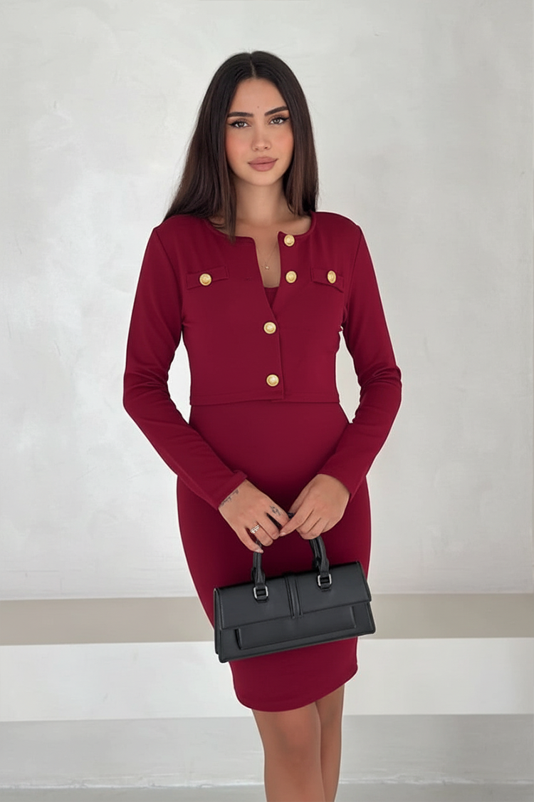 - Το φόρεμα έχει εφαρμοστή γραμμή και κοντό μήκος, ενώ η ζακέτα έχει κουμπιά και κοντό μήκος.