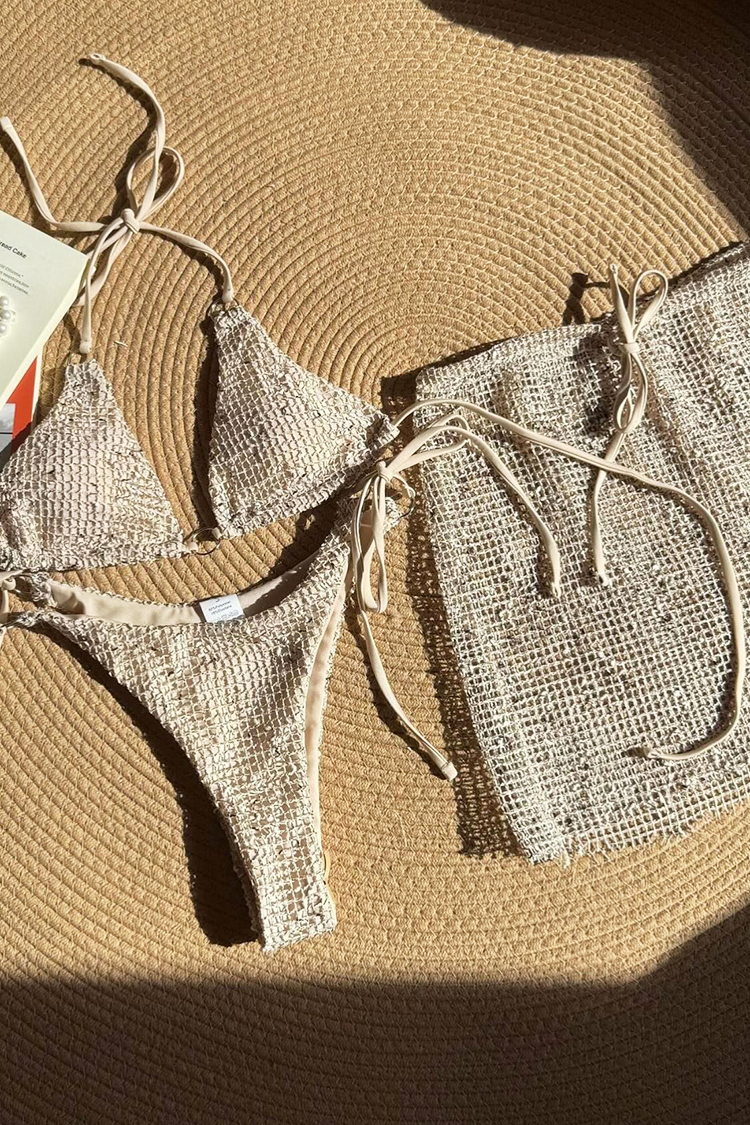 - Το σετ αποτελείται από τρία κομμάτια και έχει ελκυστικό σχέδιο, που θα τονίσει το μοναδικό στυλ και το μαύρισμα σας! Το πάνω μέρος έχει αφαιρούμενα μαξιλαράκια που διαμορφώνουν το ντεκολτέ.