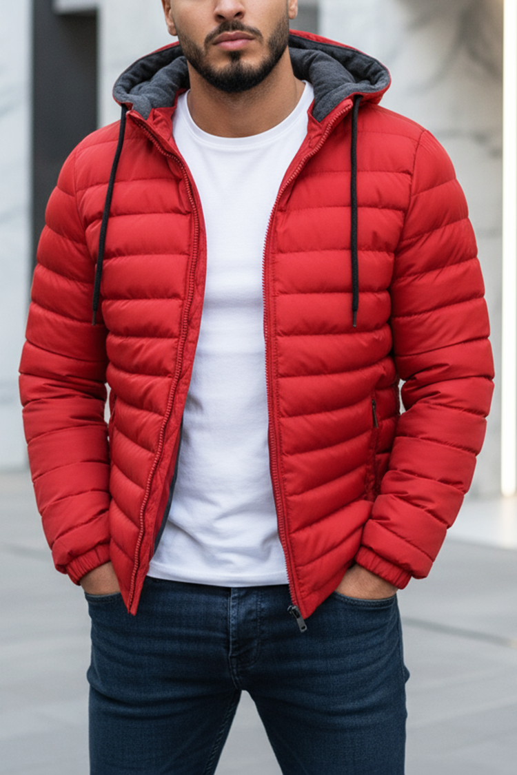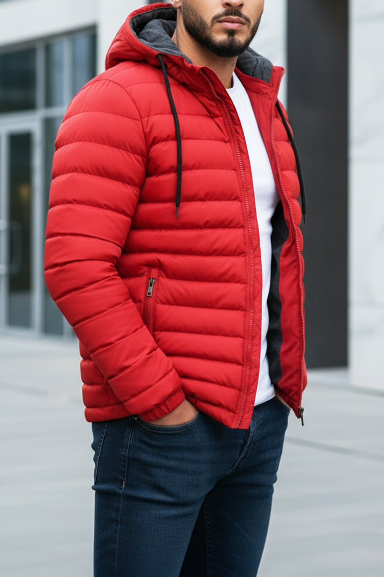 - Σας προσφέρουμε την ειδική μας προσφορά: ανδρικό χειμωνιάτικο μπουφάν σε μοντέρνο σχέδιο σε κόκκινο χρώμα.