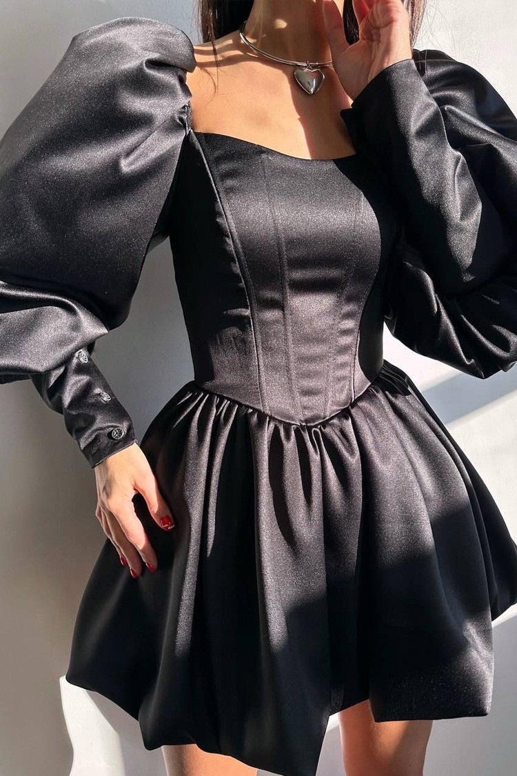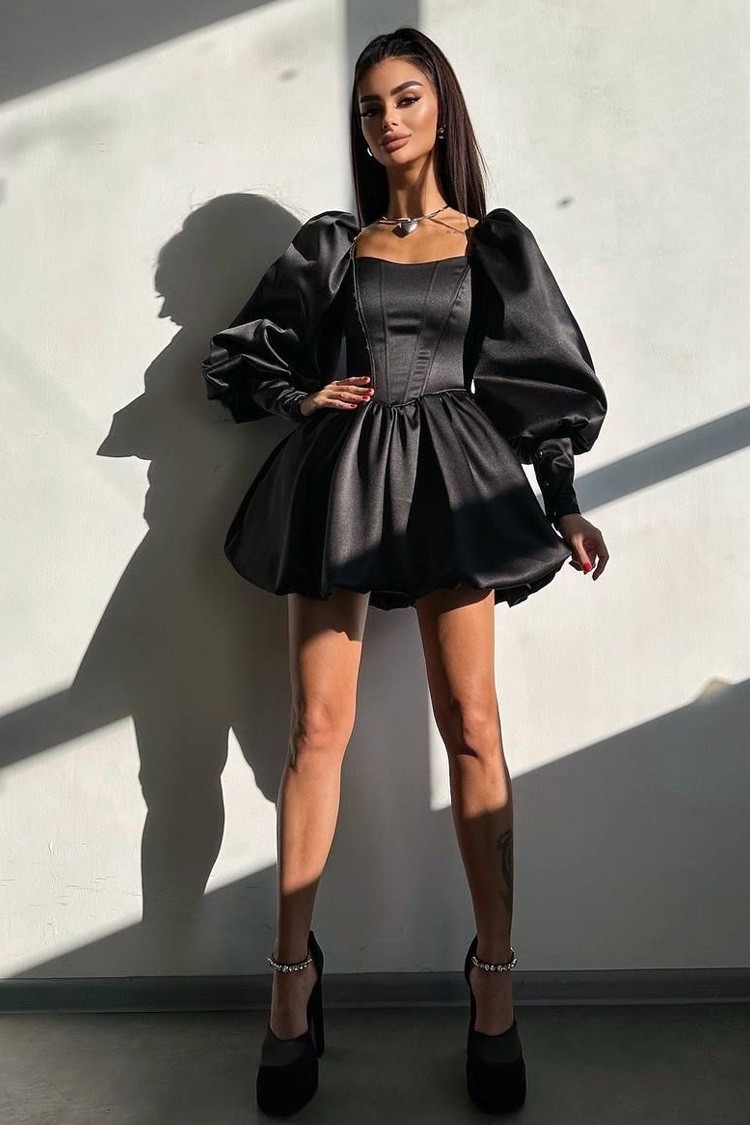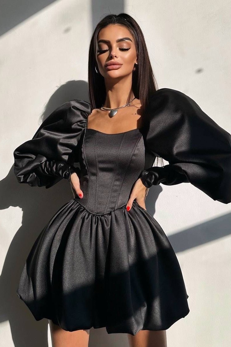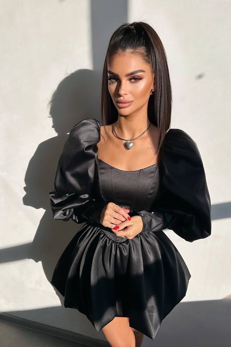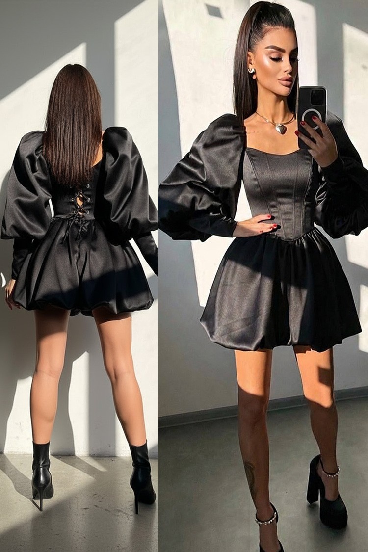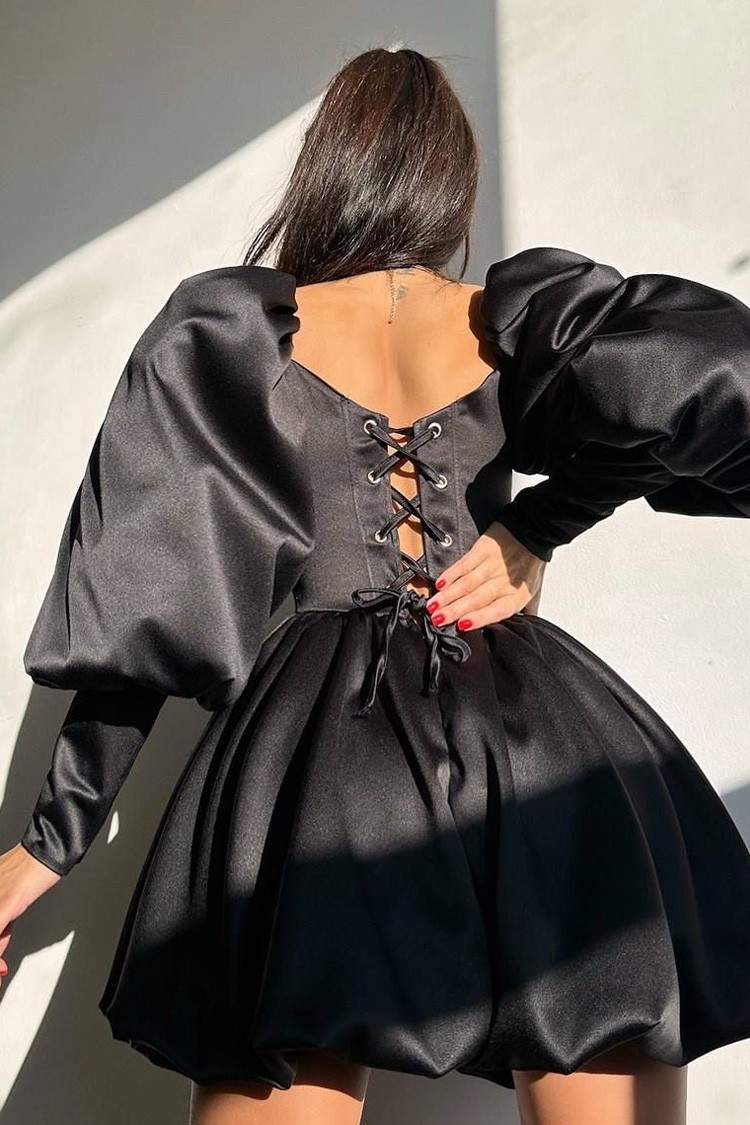- Το φόρεμα έχει εφαρμοστή γραμμή, μακριά φουσκωτά μανίκια, σέξι λαιμόκοψη και πλάτη με κορδόνια.