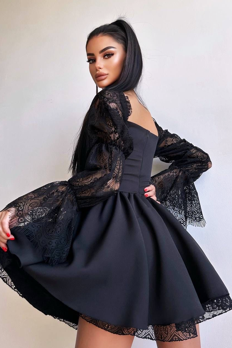- Το φόρεμα έχει εφαρμοστή γραμμή, μακριά μανίκια με δαντέλα, πεσμένους ώμους και ελκυστική λαιμόκοψη.