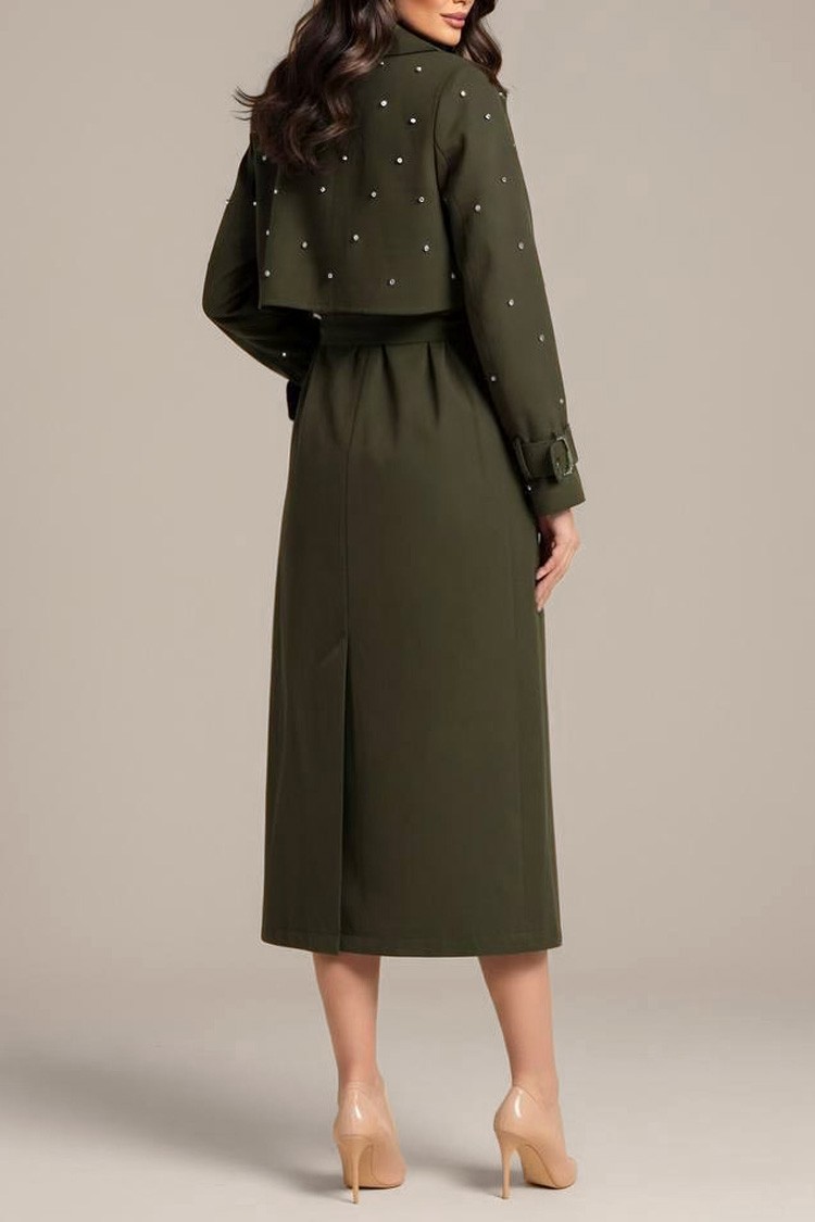 - Το μοντέλο έχει κλασική γραμμή, ζώνη και μανσέτες με αγκράφα, διακοσμητικές πέρλες και διακοσμητικό τριαντάφυλλο στο γιακά.