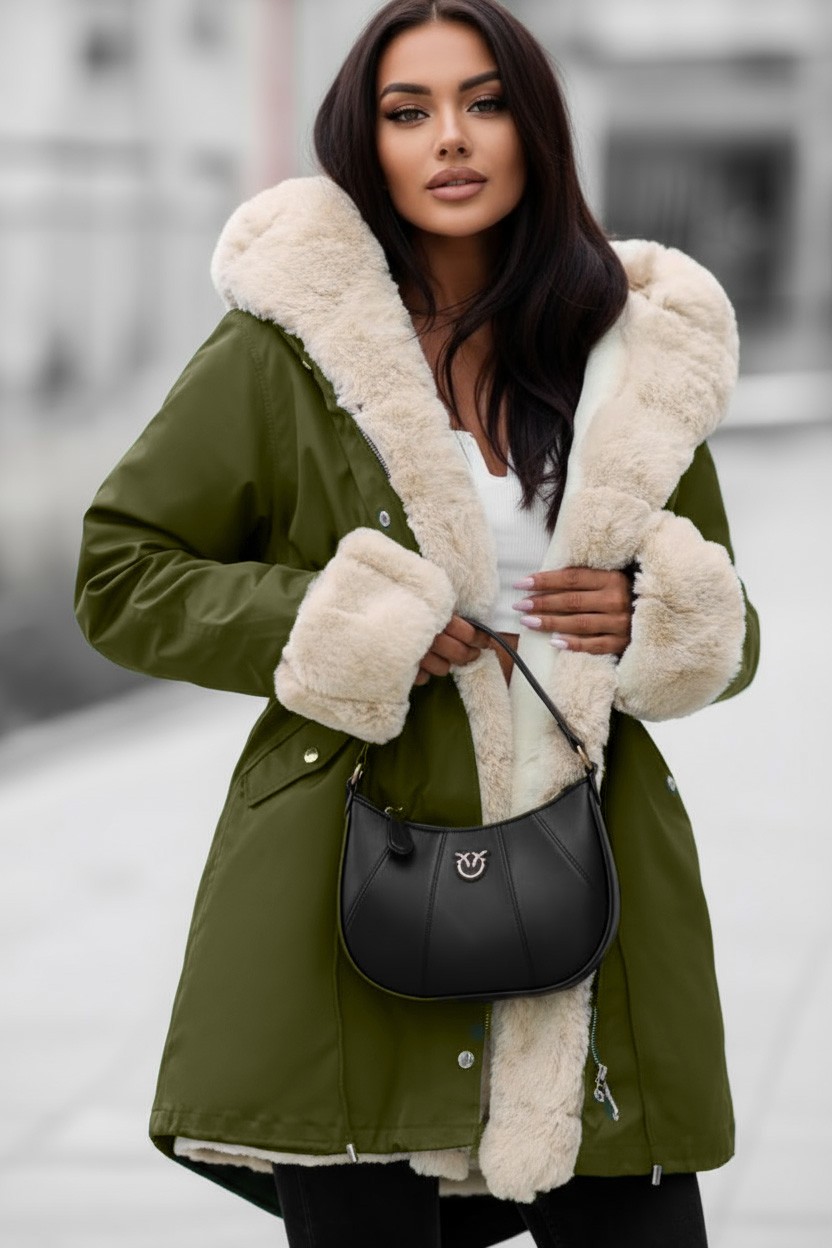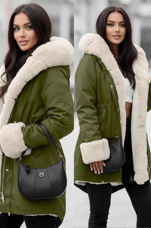 - Το μοντέλο έχει άνετη γραμμή, κλείσιμο με κουμπιά και φερμουάρ, μεγάλη κουκούλα με γούνα και μανσέτες.