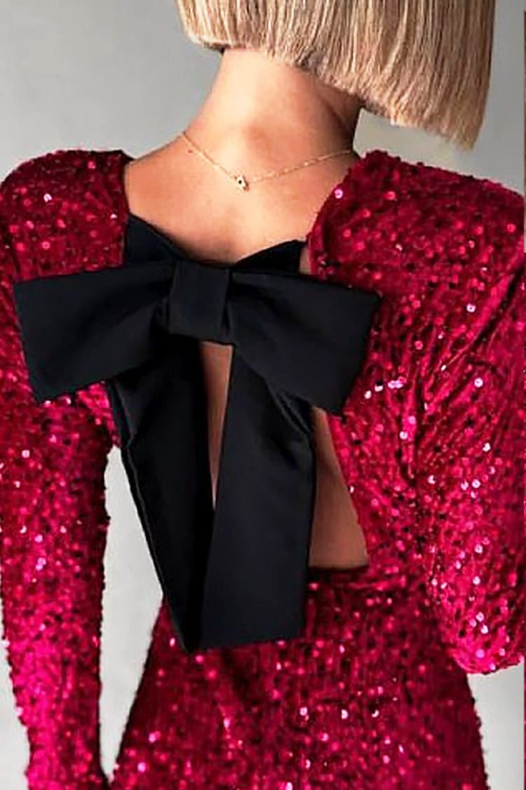 - Το μοντέλο έχει μακριά μανίκια, λαμπερό εφέ και κομμένη πλάτη διακοσμημένη με εντυπωσιακή κορδέλα για εντυπωσιακή εμφάνιση.