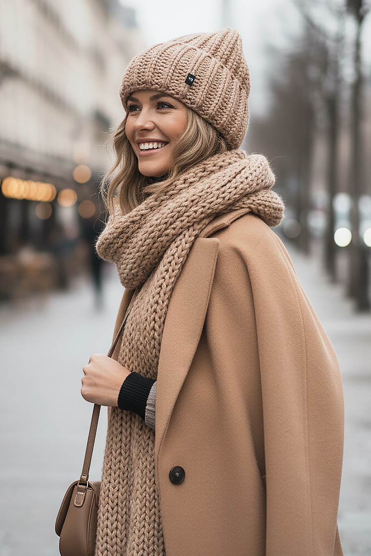 - Συμπληρώστε την εμφάνισή σας με ένα σετ δύο τεμαχίων – σκουφάκι και κασκόλ με μονόχρωμο μοτίβο.
