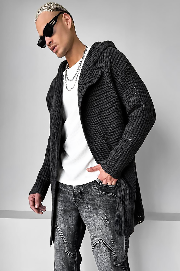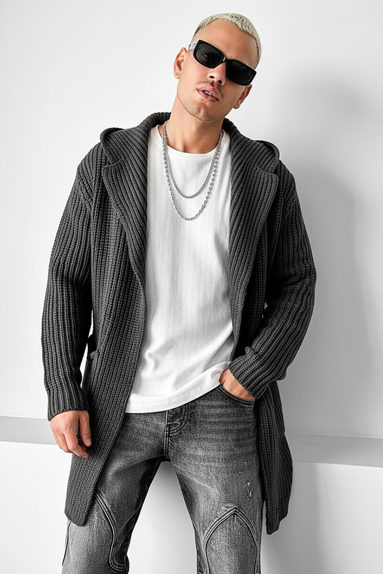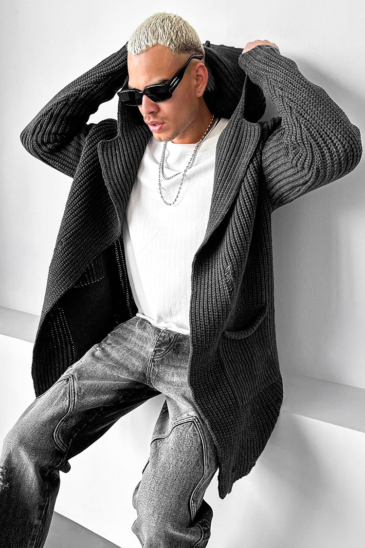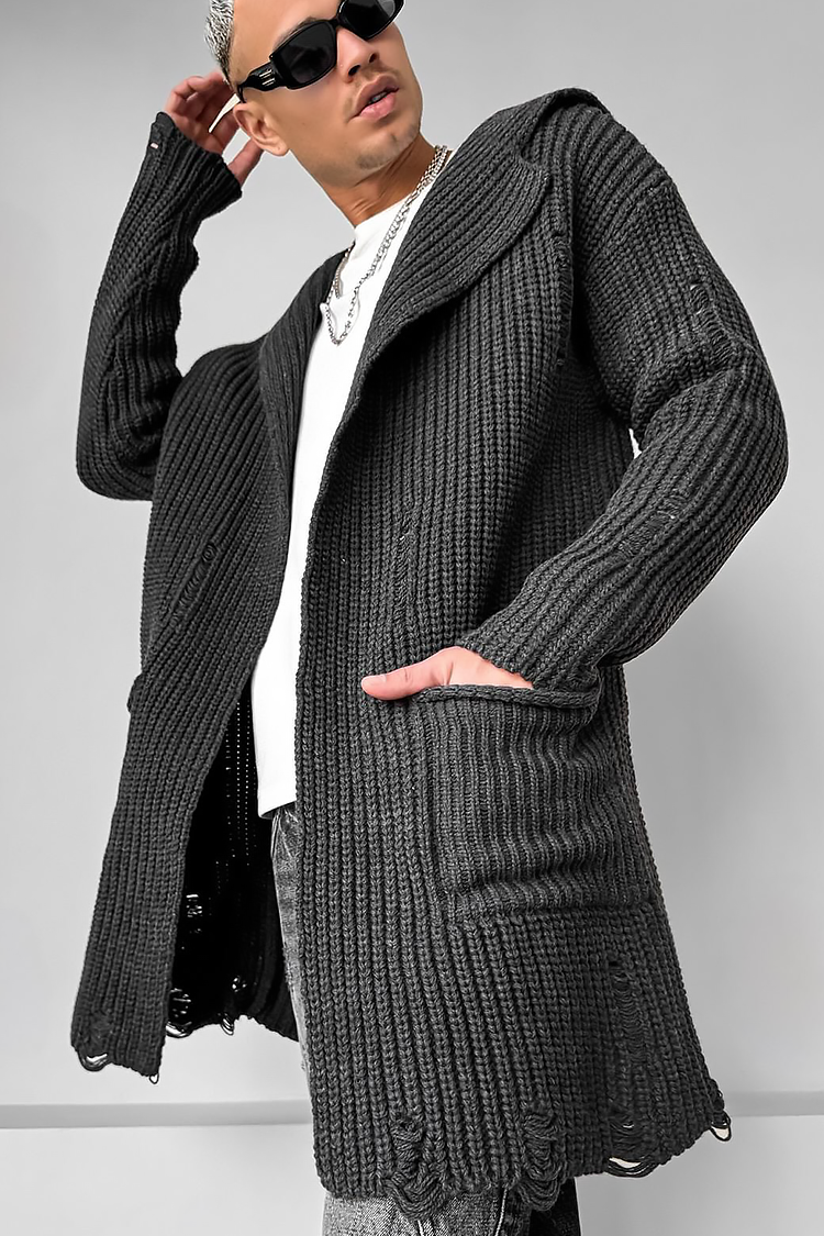 - Άνετη ανδρική ζακέτα με κουκούλα και τσέπες σε χρώμα γραφίτη, κατάλληλη για την καθημερινή σας εμφάνιση.