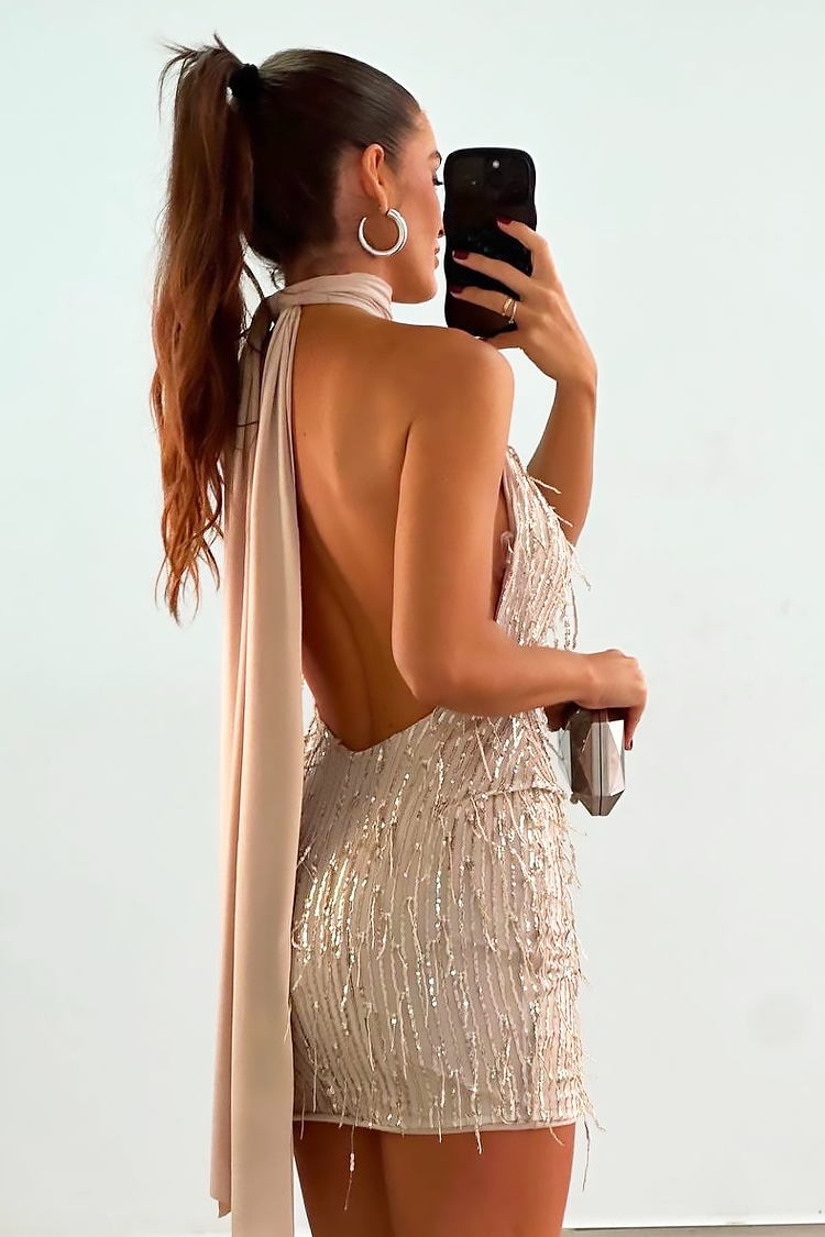 - Το μοντέλο είναι κοντό, με σέξι εφαρμοστή γραμμή, γυμνή πλάτη και ψηλό γιακά με κορδόνια στο πίσω μέρος.