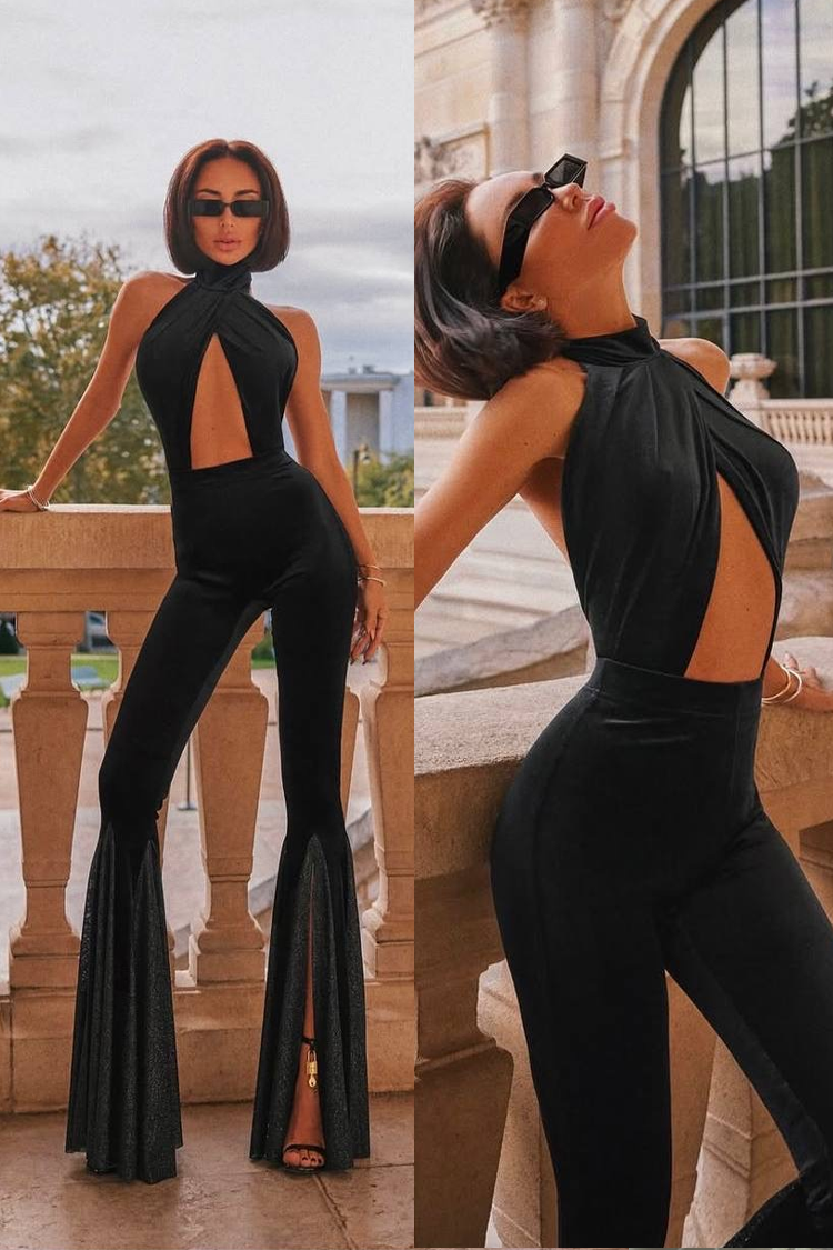 - Κομψή ολόσωμη φόρμα σε μαύρο χρώμα, κατάλληλη για διάφορους συνδυασμούς μόδας και εμφανίσεις σε πάρτι.