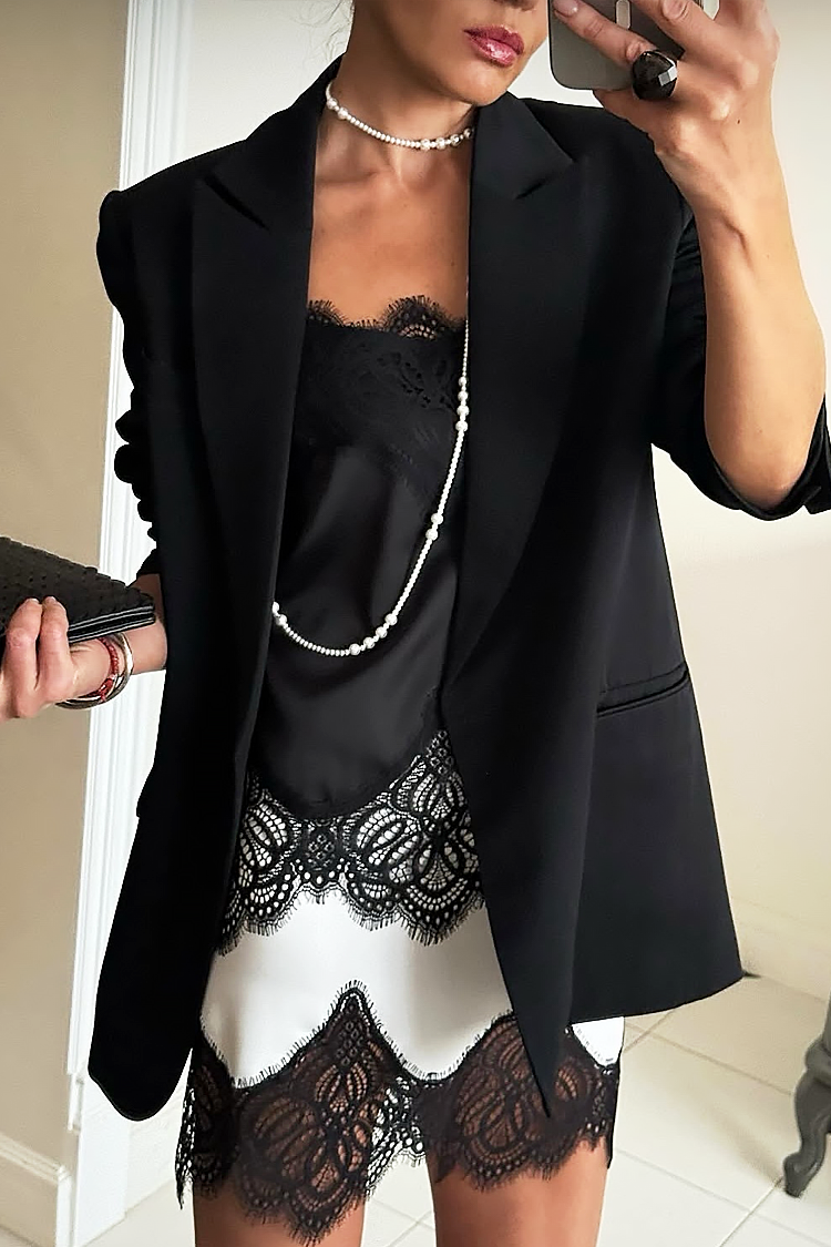 - Η φούστα είναι κοντή, με δίχρωμο μοτίβο και δαντέλα, ενώ το τοπ έχει λεπτές τιράντες και σέξι λαιμόκοψη.