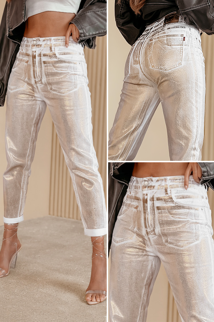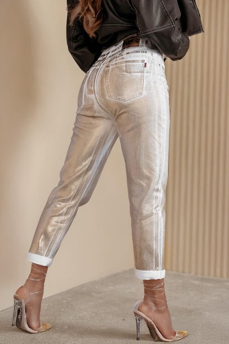 - Το μοντέλο έχει ψηλή μέση, φαρδιά μπατζάκια με στρίφωμα και εντυπωσιακή λάμψη.