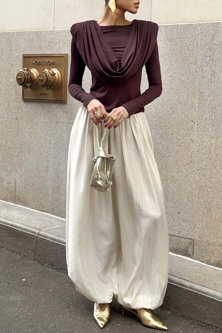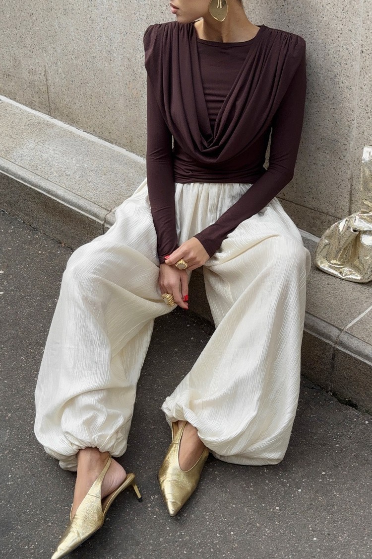 - Η μπλούζα έχει μακριά μανίκια, εντυπωσιακή γραμμή και ελκυστικές σούρες στην λαιμόκοψη.