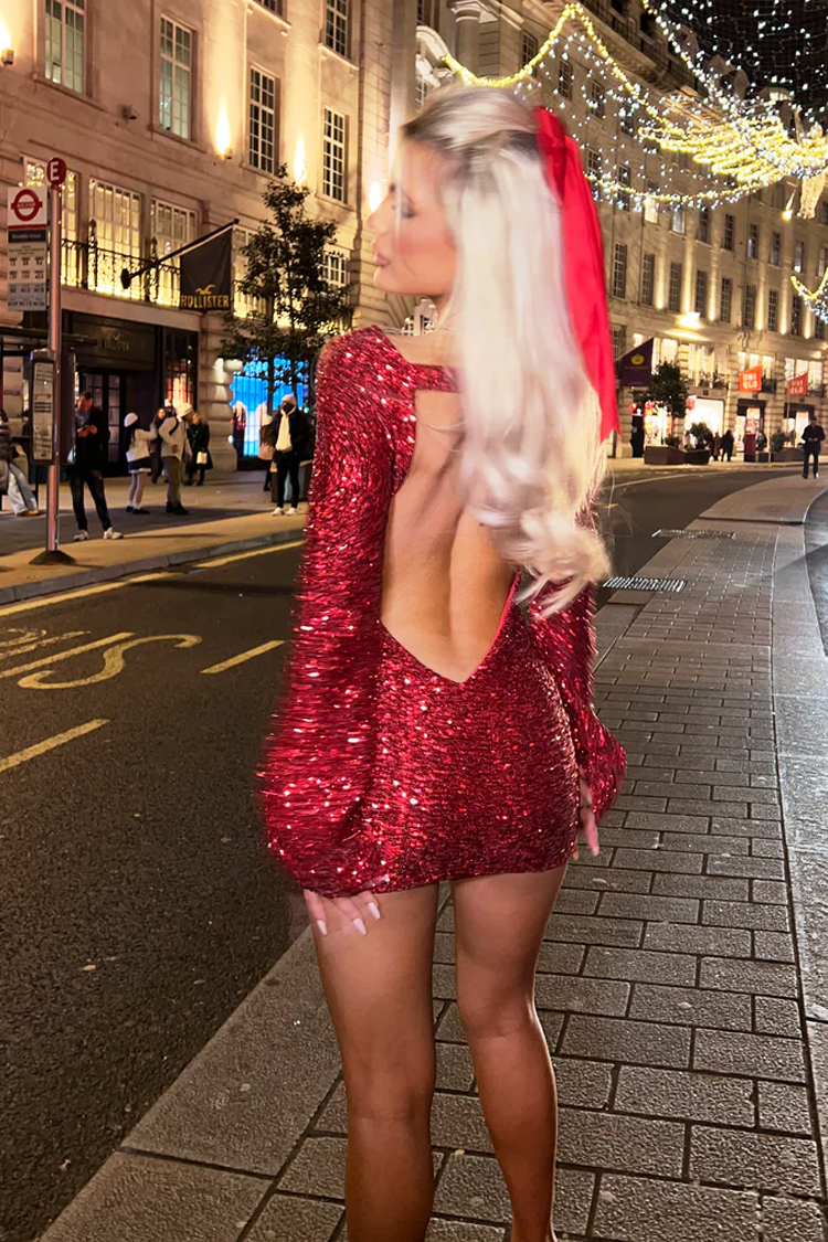 - Το μοντέλο έχει εφαρμοστή γραμμή, γυαλιστερές λεπτομέρειες σε όλο το μήκος, μακριά μανίκια και γυμνή πλάτη.