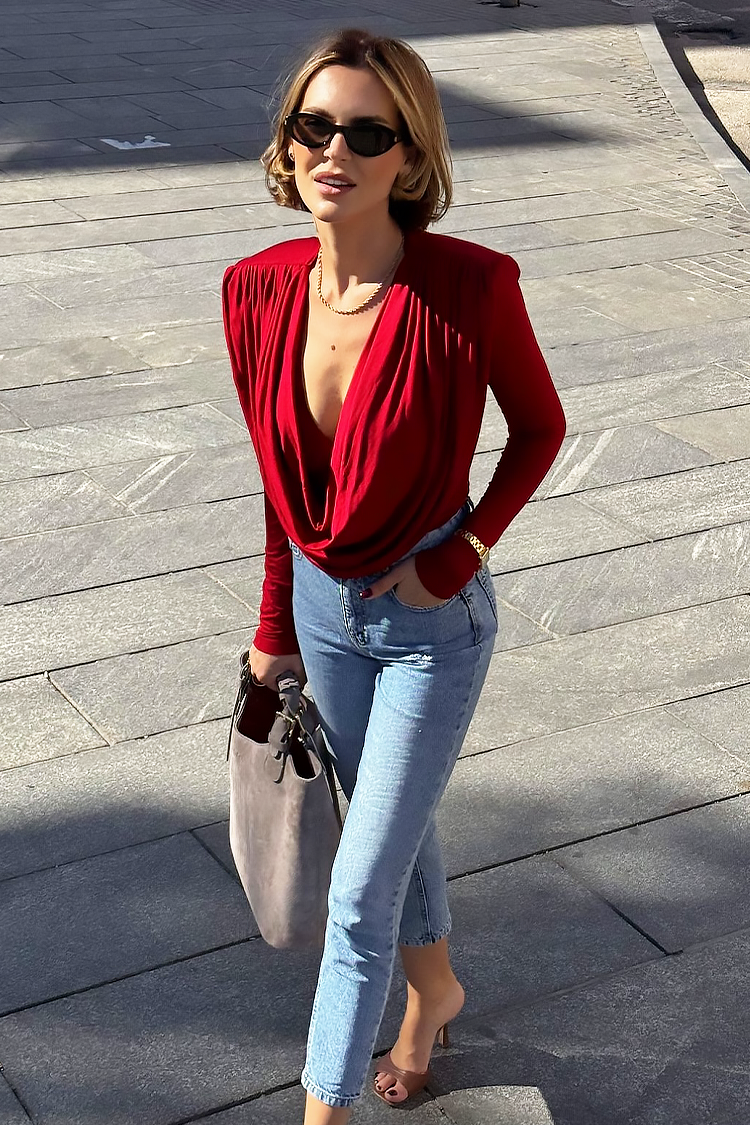 - Η μπλούζα έχει μακριά μανίκια, εντυπωσιακή γραμμή και ελκυστική λαιμόκοψη με σούρες.
