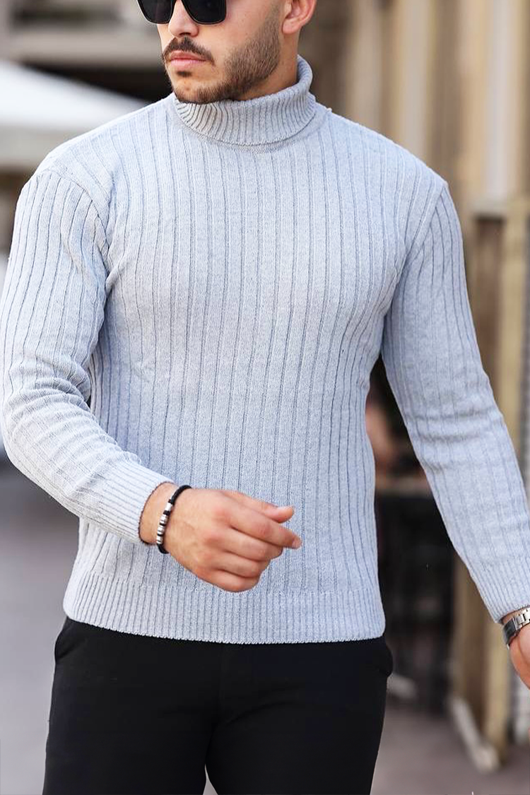 - Άνετο ανδρικό πουλόβερ με ζιβάγκο και κάθετο ριπ σχέδιο σε γκρι χρώμα, κατάλληλο για διάφορους συνδυασμούς μόδας.