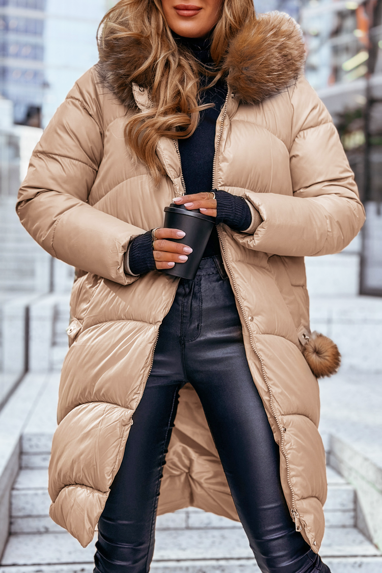 - Το μοντέλο διαθέτει κουκούλα με γούνα και πρακτικές τσέπες, καπιτονέ σχέδιο και διακοσμητικό πούπουλο στην τσέπη.