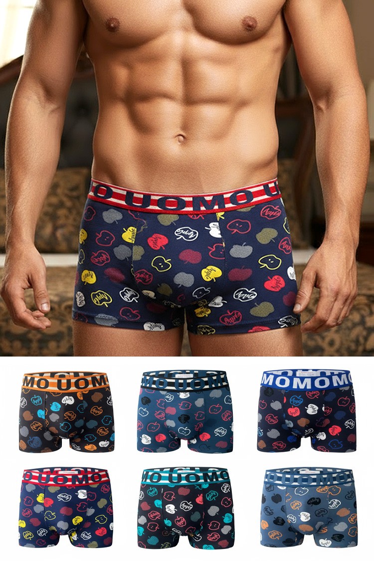 - Σετ από έξι ανδρικά μποξεράκια με τυπωμένο σχέδιο μήλων, κατασκευασμένα από βαμβακερό, αναπνέον ύφασμα.