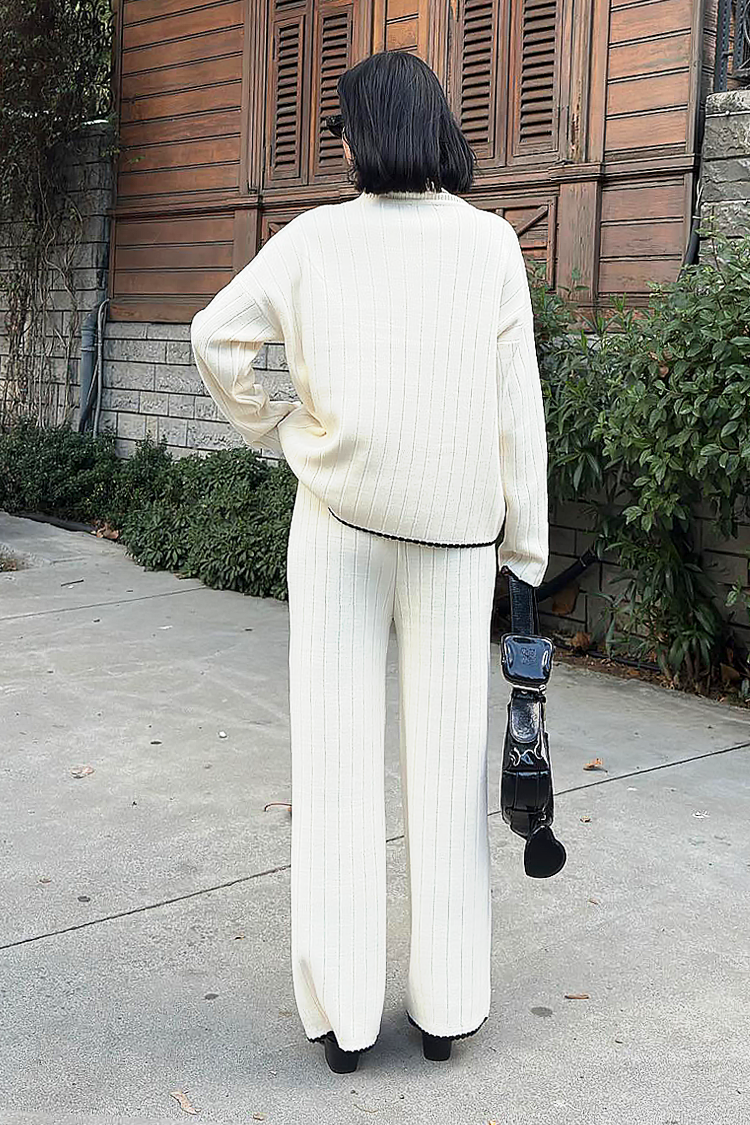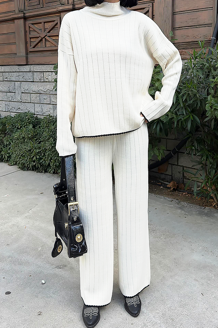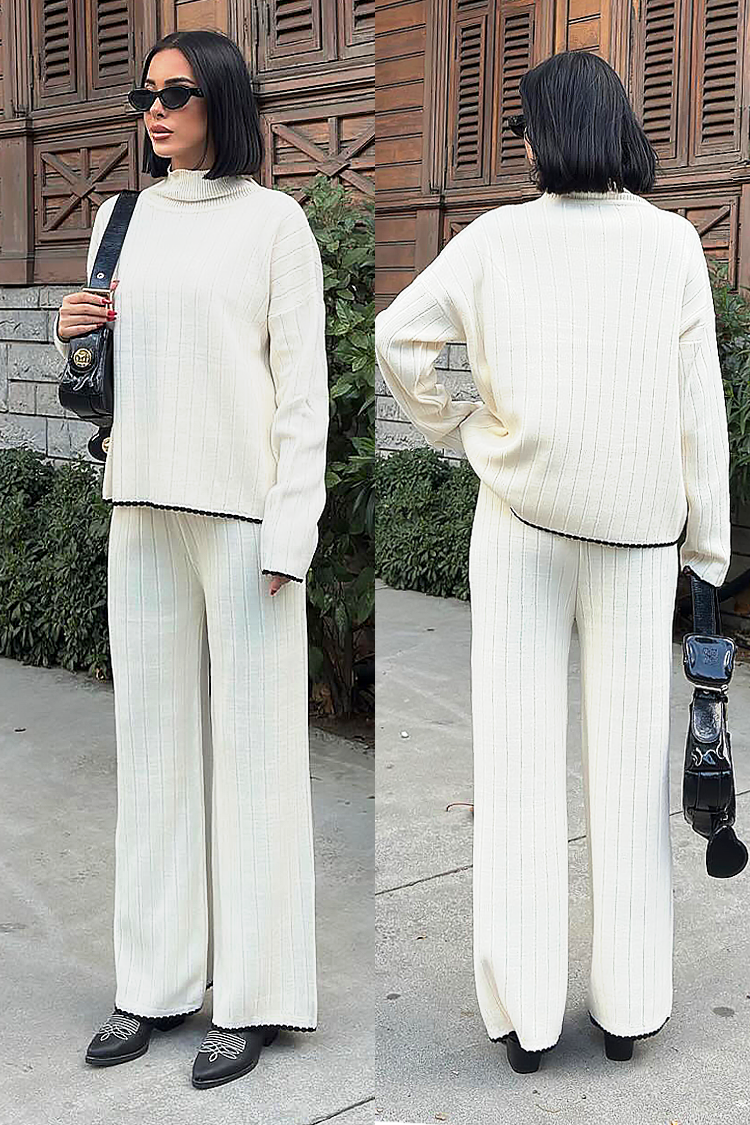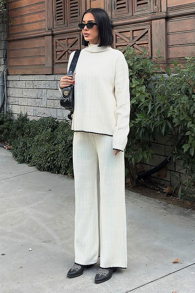 - Η μπλούζα έχει ελεύθερη γραμμή, ενώ το παντελόνι έχει υψηλή μέση και φαρδιά μπατζάκια.