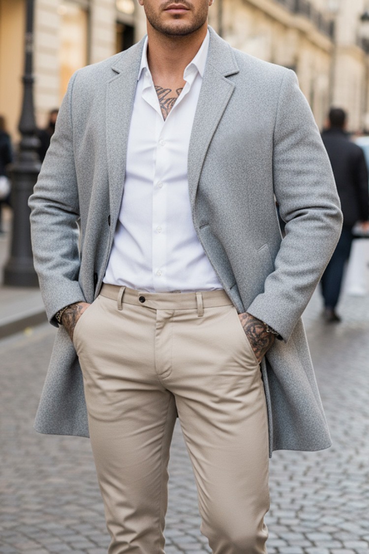 - Κομψό ανδρικό παλτό σε γκρι χρώμα, με το οποίο θα τραβήξετε όλα τα βλέμματα.
