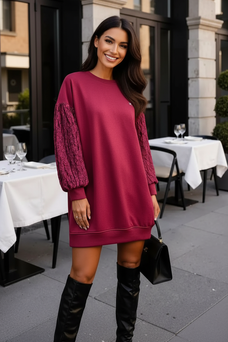 - Το μοντέλο έχει φαρδιά γραμμή και εντυπωσιακά μακριά μανίκια με κλασική στρογγυλή λαιμόκοψη.