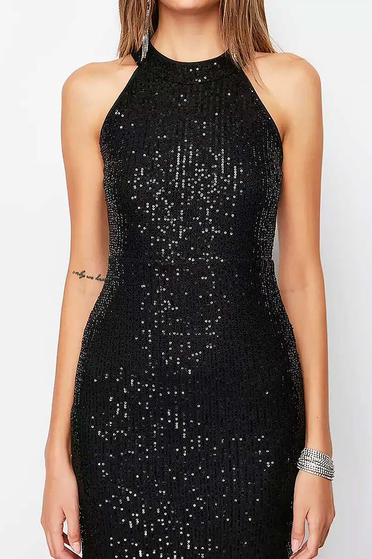 - Το μοντέλο έχει σέξι γραμμή, παγιέτες και εφαρμοστό σχέδιο.