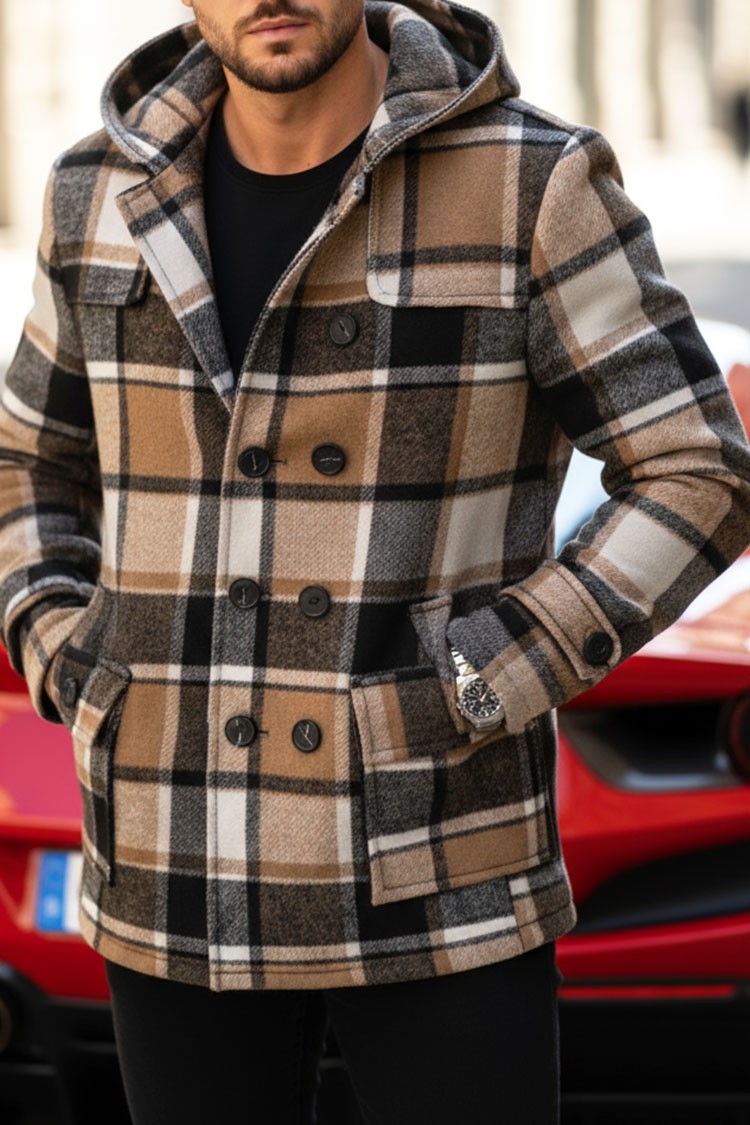 - Πρακτικό ανδρικό παλτό σε μπεζ χρώμα με καρό σχέδιο, κατασκευασμένο από υψηλής ποιότητας ζεστό ύφασμα.