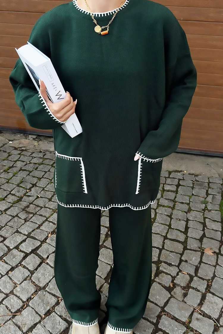 - Το πουλόβερ έχει κλασική γραμμή και τσέπες, ενώ το παντελόνι είναι με ψηλή μέση και φαρδιά γραμμή.