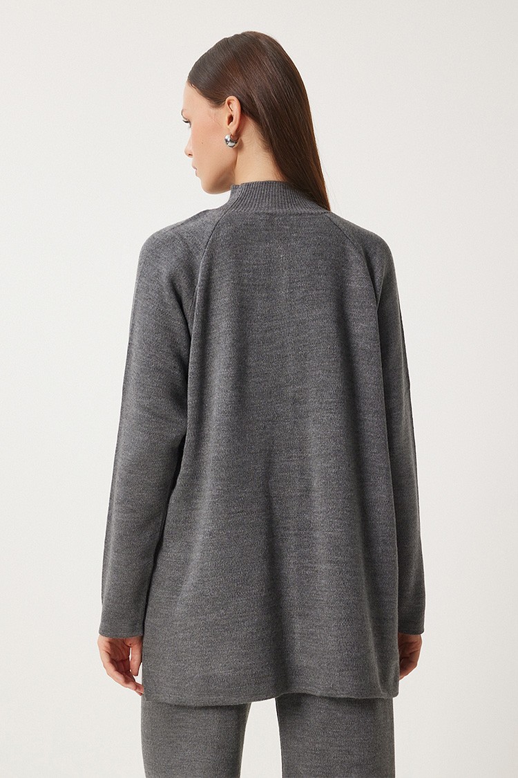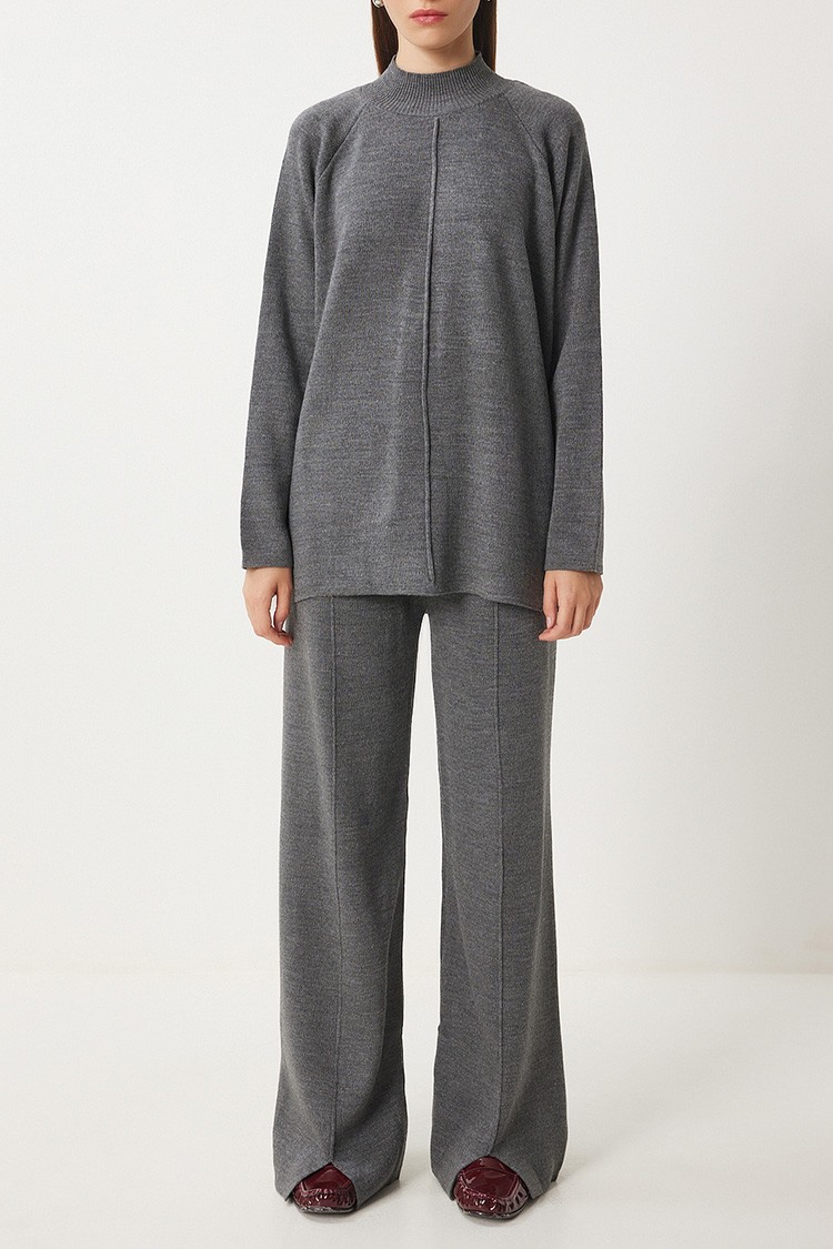 - Το πουλόβερ έχει ελεύθερη γραμμή και ζιβάγκο, ενώ το παντελόνι έχει υψηλή μέση και ελεύθερη γραμμή.