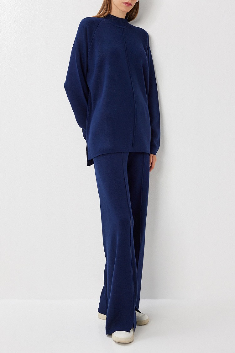 - Το πουλόβερ έχει ελεύθερη γραμμή και ζιβάγκο, ενώ το παντελόνι έχει υψηλή μέση και ελεύθερη γραμμή.