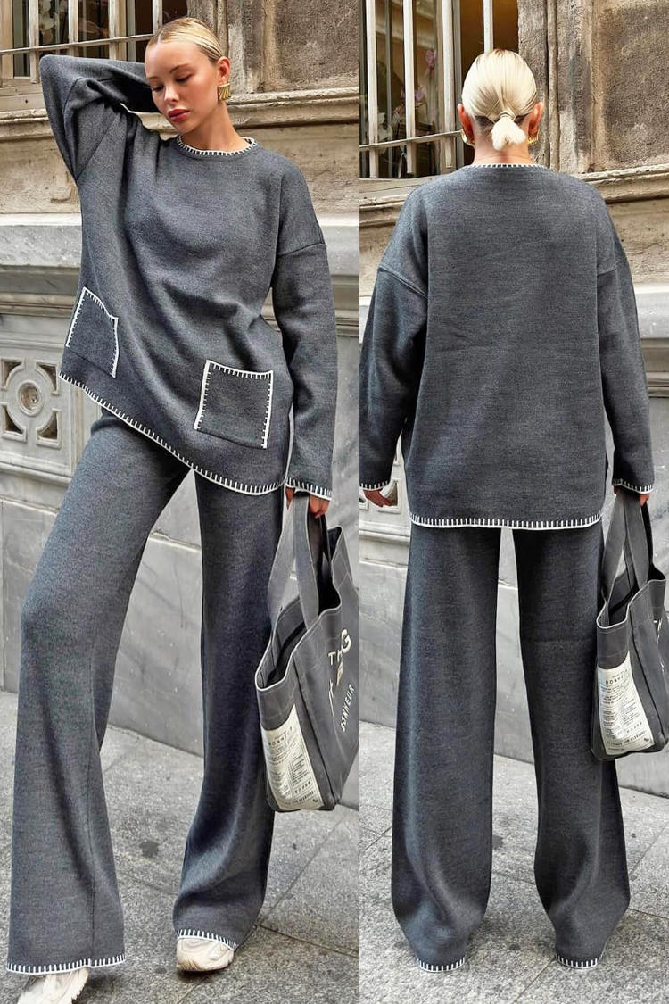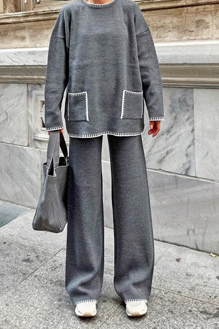 - Το πουλόβερ έχει κλασική γραμμή και τσέπες, ενώ το παντελόνι είναι με ψηλή μέση και φαρδιά γραμμή.