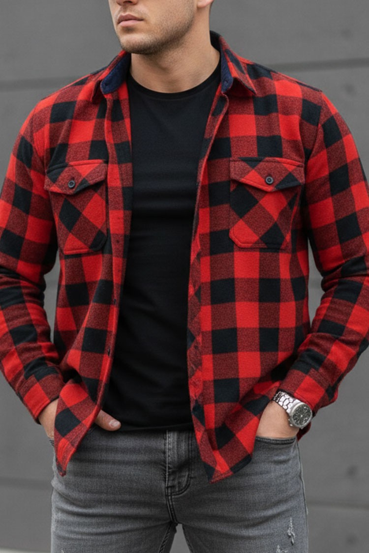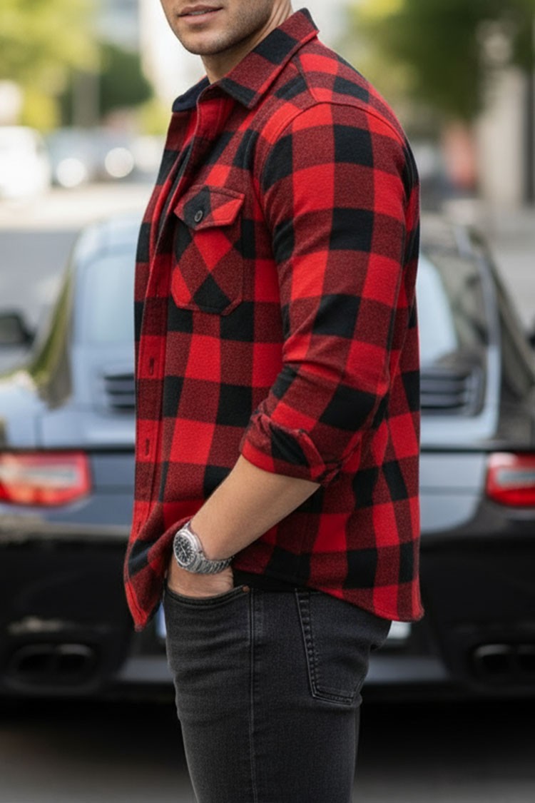 - Μοντέρνο ανδρικό πουκάμισο με καρό μοτίβο σε κόκκινο χρώμα, με μυτερό γιακά και μεγάλες τσέπες.
