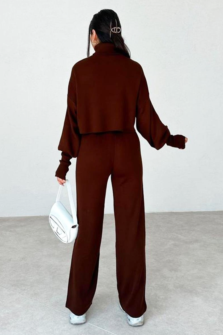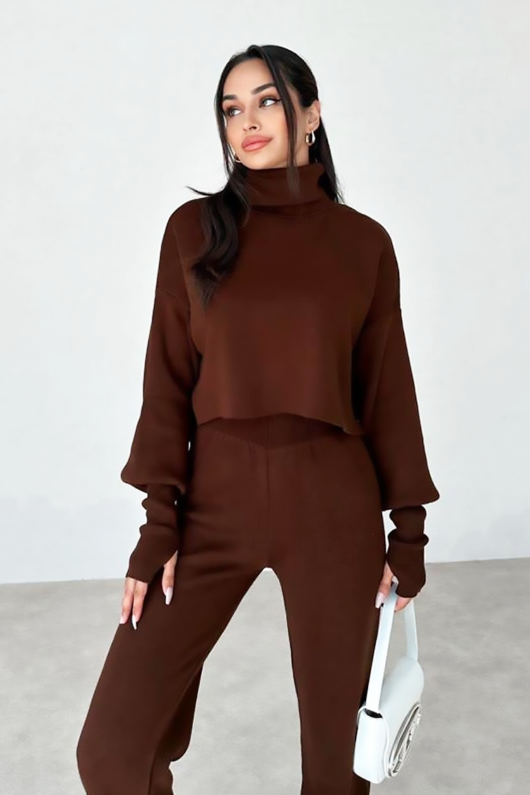 - Το πουλόβερ έχει ελεύθερη γραμμή και ζίβαγκο, ενώ το παντελόνι έχει υψηλή μέση και ελεύθερη γραμμή.