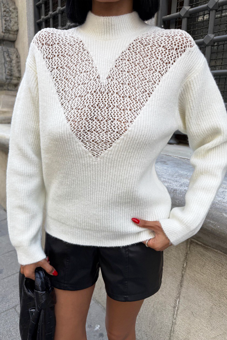 - Το μοντέλο έχει ψηλό γιακά και εντυπωσιακό πλέξιμο μπροστά.