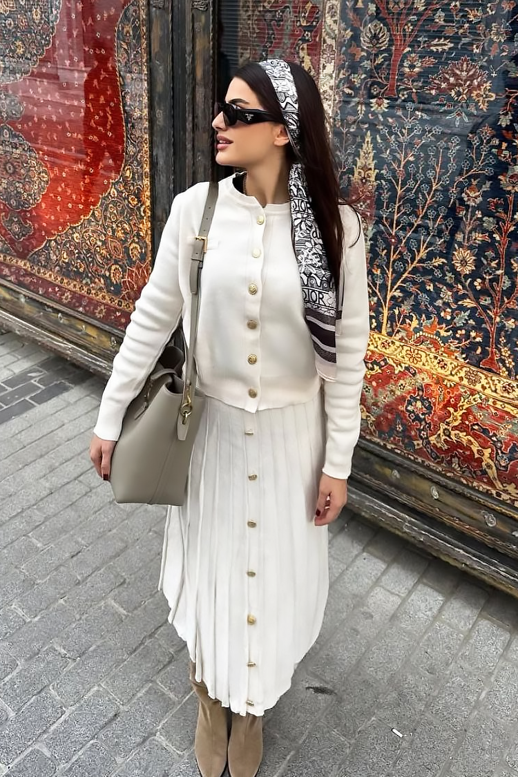 - Το μοντέλο έχει midi φούστα με εντυπωσιακά κουμπιά κατά μήκος και ζακέτα με κλασική γραμμή.