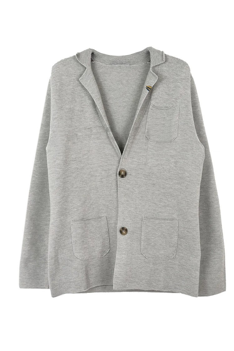 - Το μοντέλο έχει ελεύθερη γραμμή και λιτό σχεδιασμό. Η ζακέτα έχει γιακά με πέτο, τσέπες και κλείνει με κουμπιά.