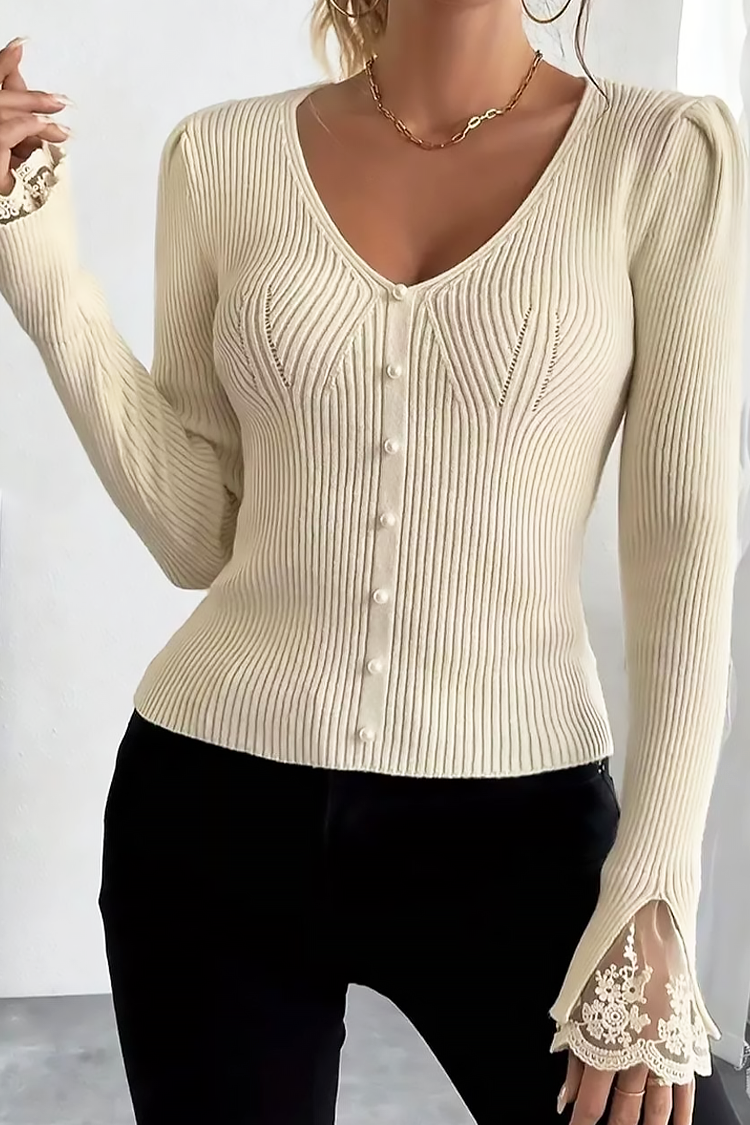 - Η μπλούζα έχει μακριά μανίκια, διακοσμητικά κουμπιά, εφαρμοστή γραμμή και κομψή λεπτομέρεια από δαντέλα.