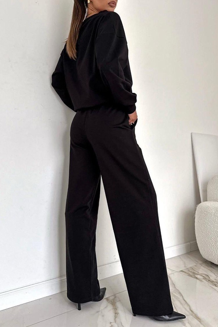 - Η μπλούζα έχει ελεύθερη γραμμή και στρογγυλή λαιμόκοψη, ενώ το παντελόνι έχει ψηλή μέση και φαρδιά μπατζάκια με λάστιχο στο τέλος.