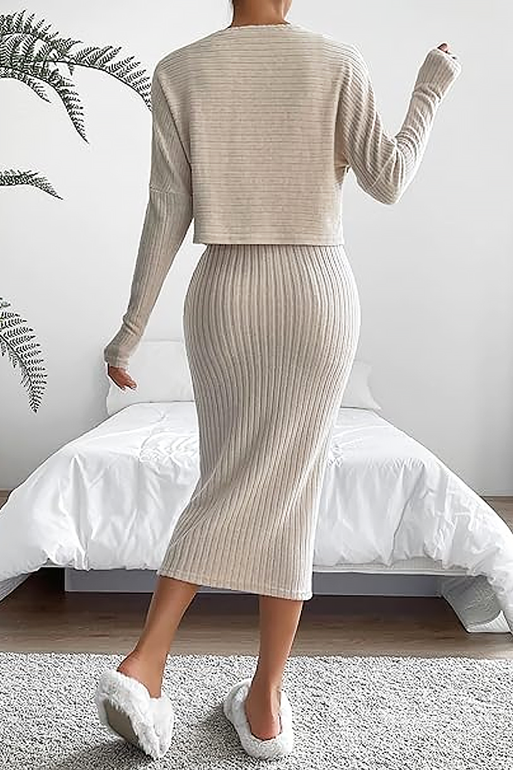 - Μοντέρνο σετ από δύο κομμάτια σε μπεζ χρώμα, κατάλληλο για διάφορες περιστάσεις.