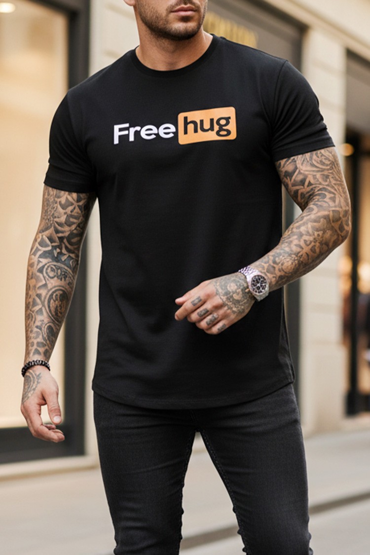 - Πρακτικό ανδρικό μπλουζάκι με άνετη γραμμή και τύπωμα free hug, κατάλληλο για καθημερινή χρήση, βόλτα ή ως συμπλήρωμα της αθλητικής σας εμφάνισης.