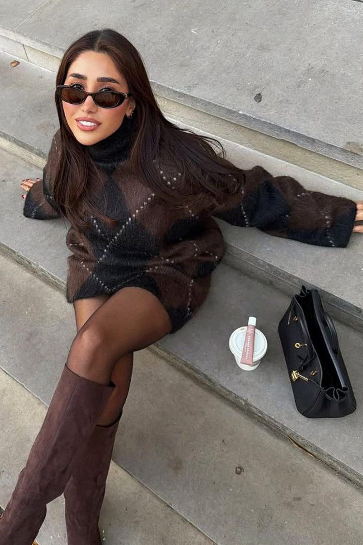 - Το πουλόβερ έχει κομψό ζιβάγκο και κλασική ελεύθερη γραμμή, ενώ η φούστα έχει ψηλή μέση και εντυπωσιακό σχέδιο.