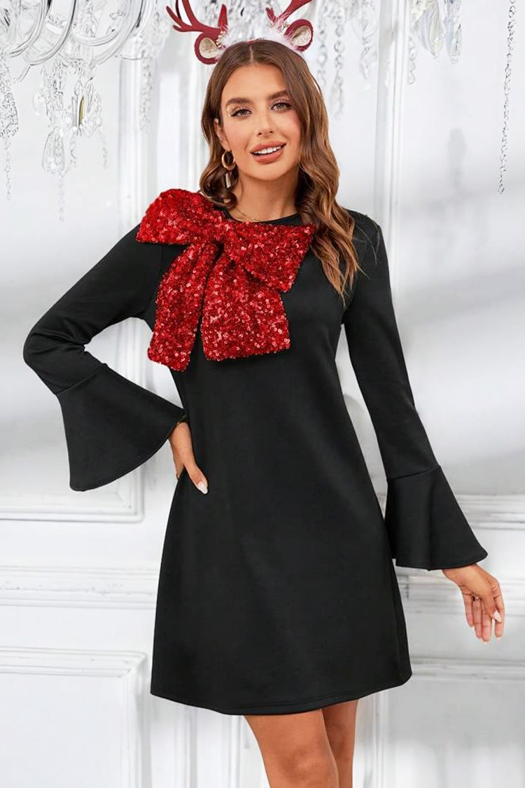 - Το μοντέλο έχει άνετη γραμμή, διακοσμητική κορδέλα από παγιέτες και φαρδιά μανίκια.
